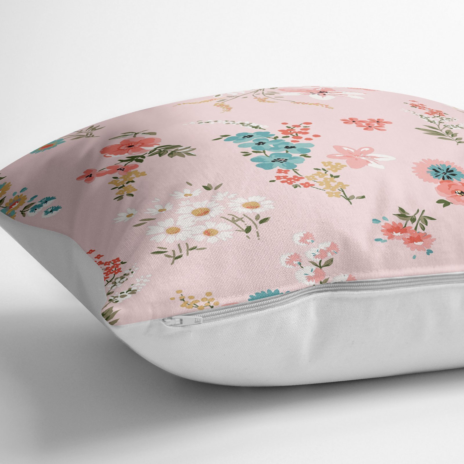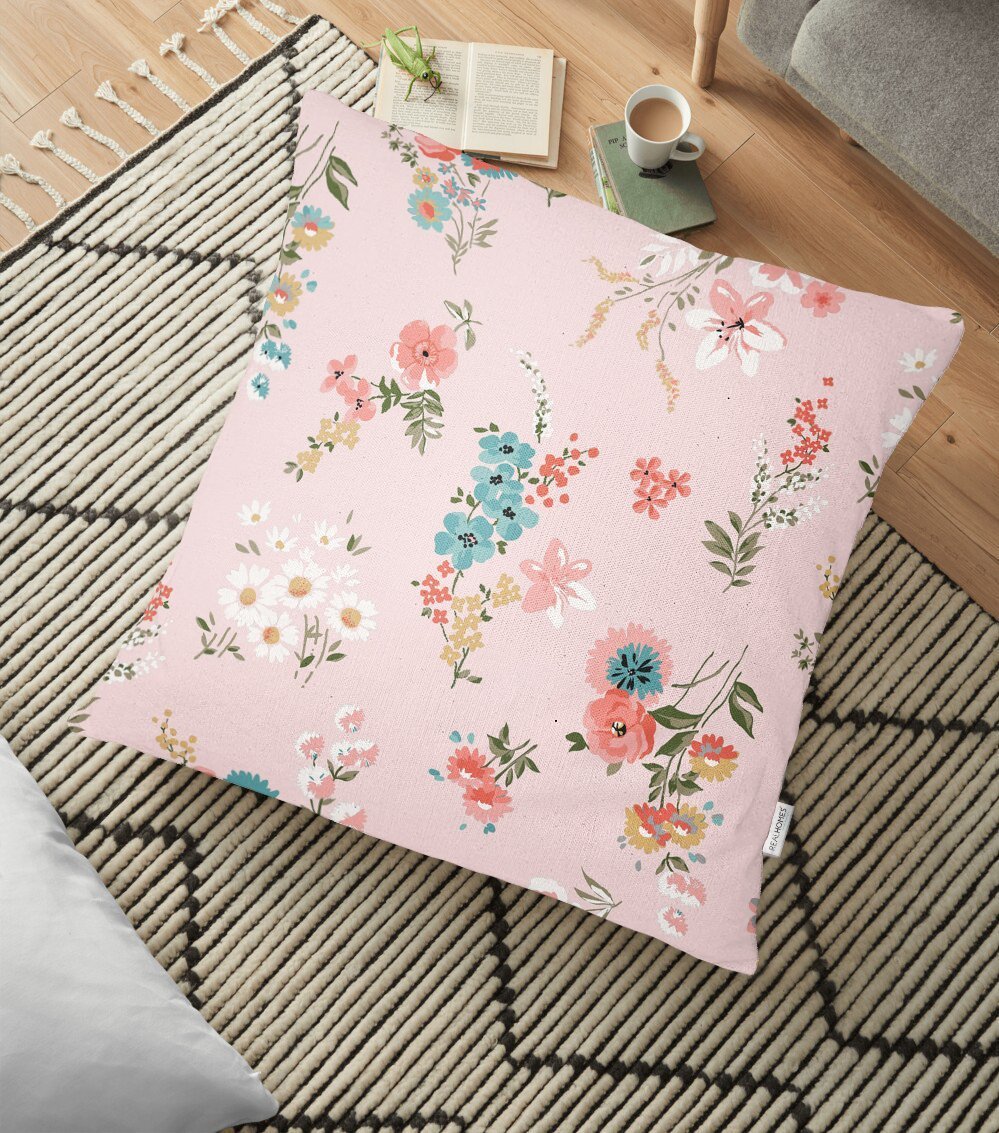Pembe Zeminli Çiçek Desenli Modern Yer Minderi – 70 x 70 cm