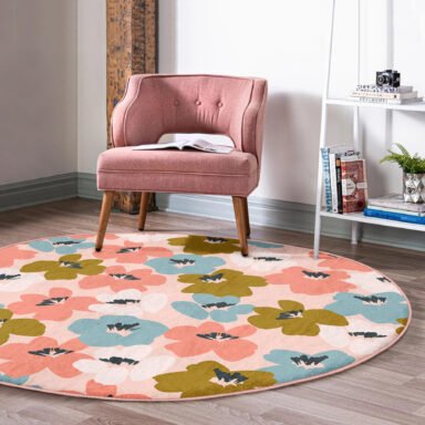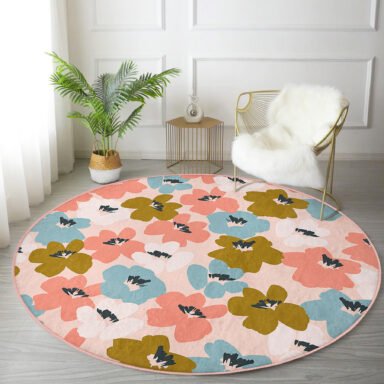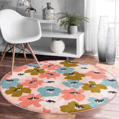 Pudra Zemin Onedraw Çizimli Renkli Çiçek Desenli Turuncu Salon Kaymaz Taban Yuvarlak Halı