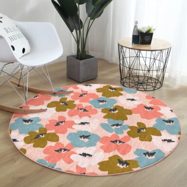 Pudra Zemin Onedraw Çizimli Renkli Çiçek Desenli Turuncu Salon Kaymaz Taban Yuvarlak Halı