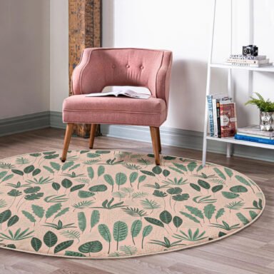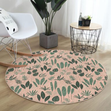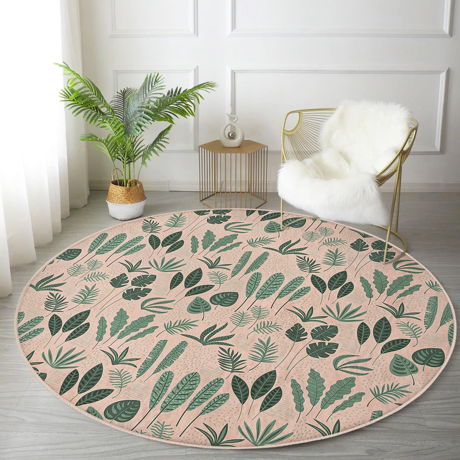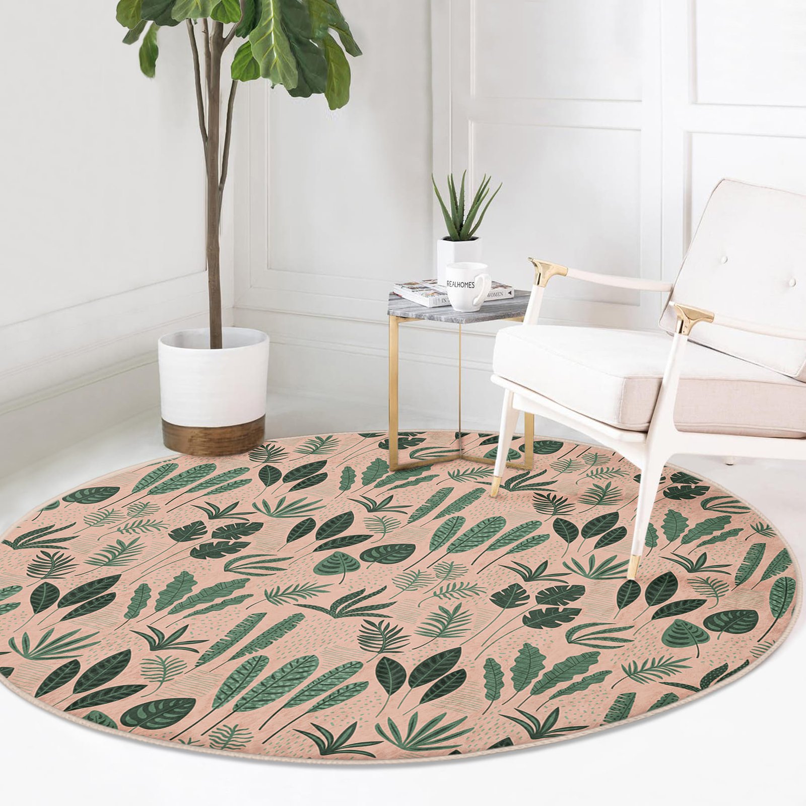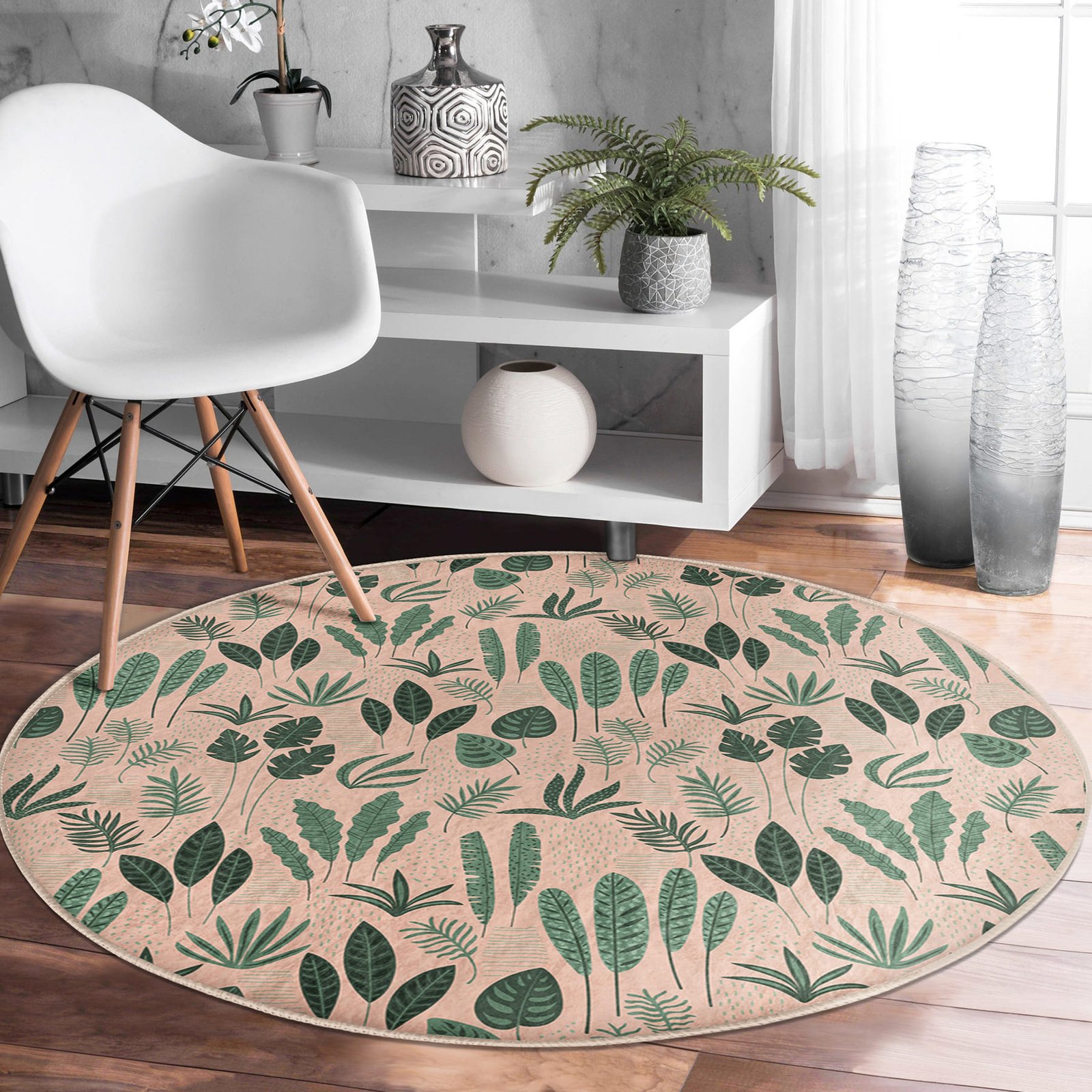 Pudra Zeminde Yeşil Yapraklı Modern Salon Ve Oturma Odası Yıkanabilir Kaymaz Tabanlı Yuvarlak Halı