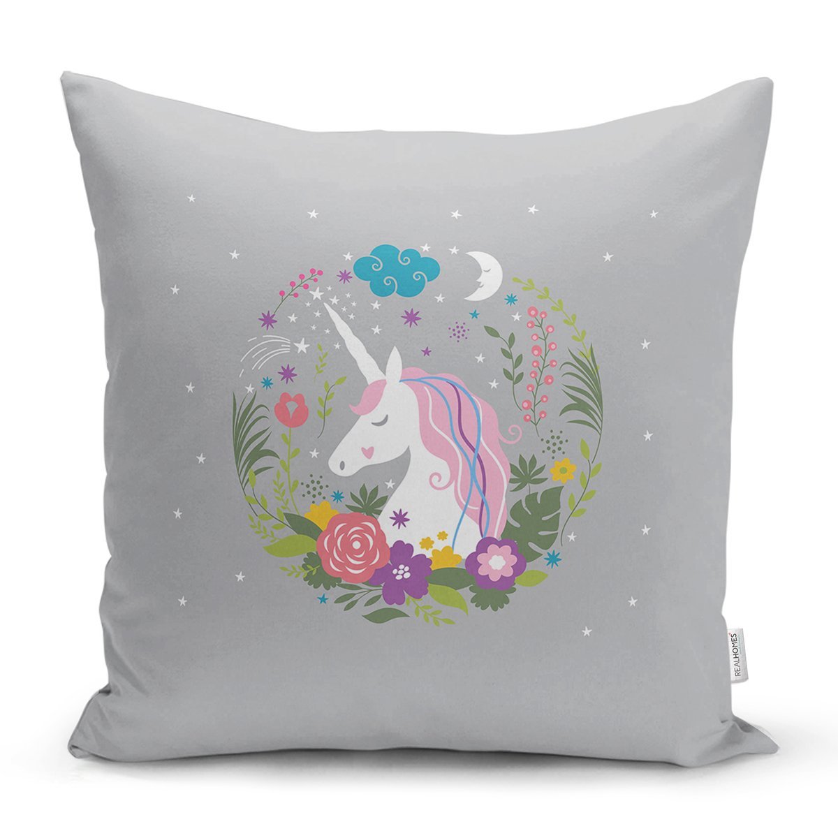 Realhomes Gri Zeminde Unicorn At Desenli Modern Yastık Kırlent Kılıfı