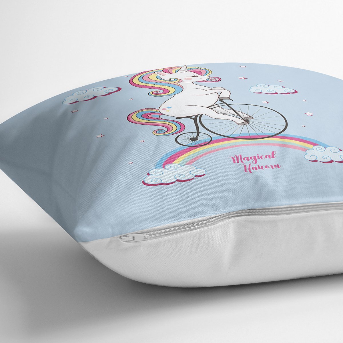 Realhomes Mavi Zeminde Bisiklet ve Unicorn Tasarımlı Modern Yastık Kırlent Kılıfı