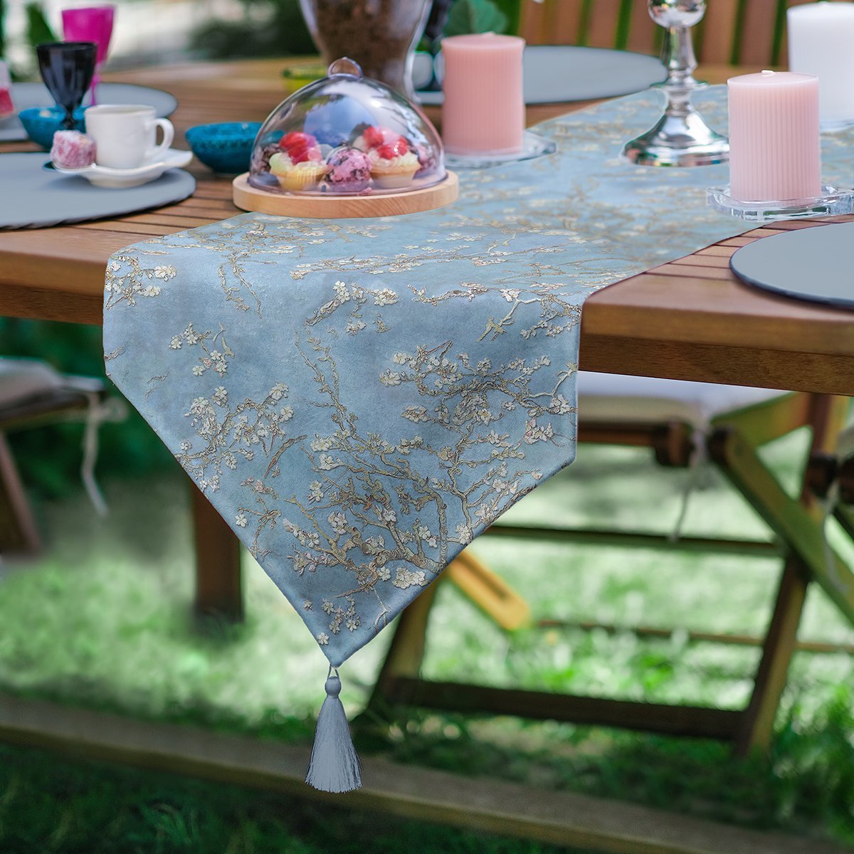 Realhomes Yağlı Boya Mavi Ağaç Motifleri Dijital Baskılı Özel Tasarım Püsküllü Şönil Üçgen Runner