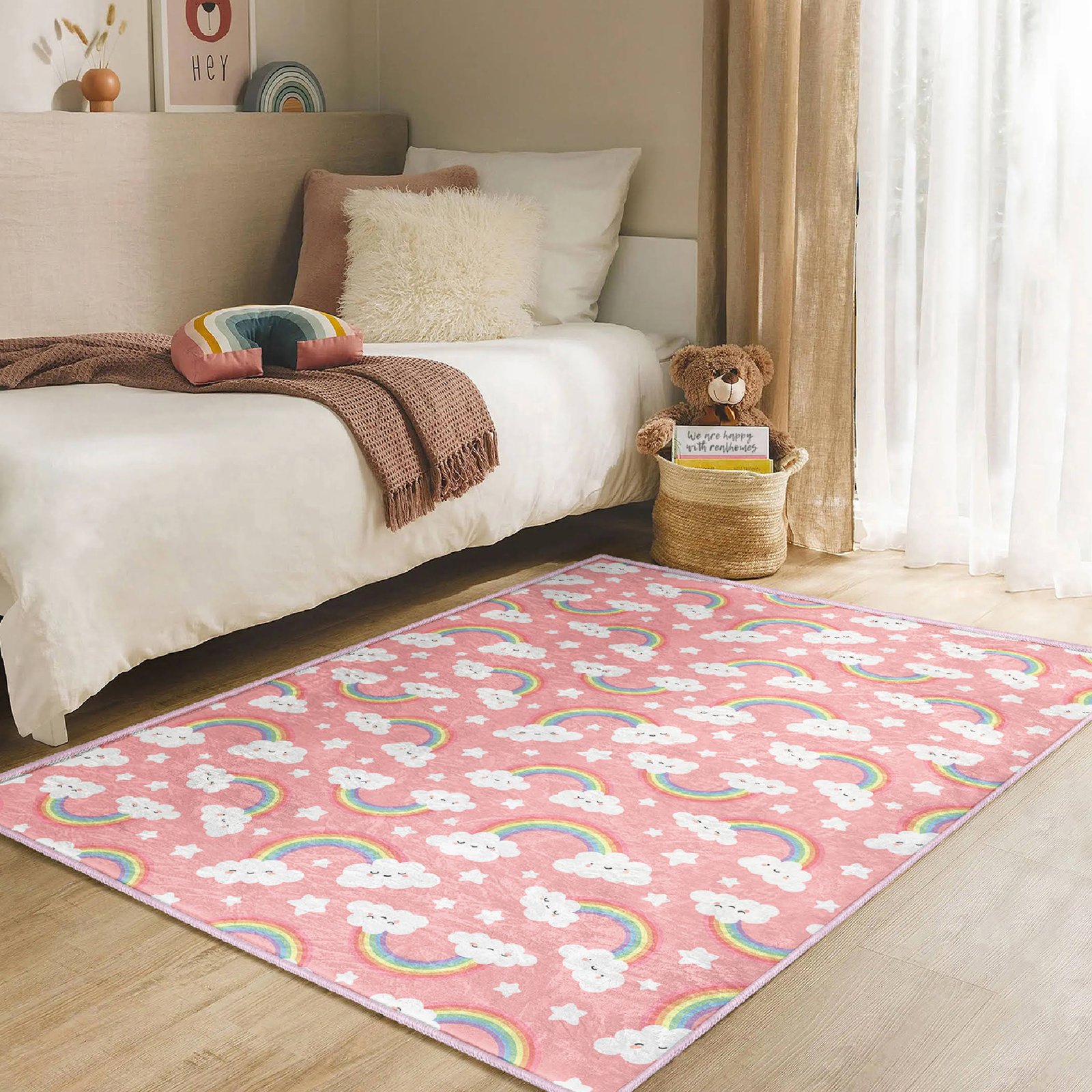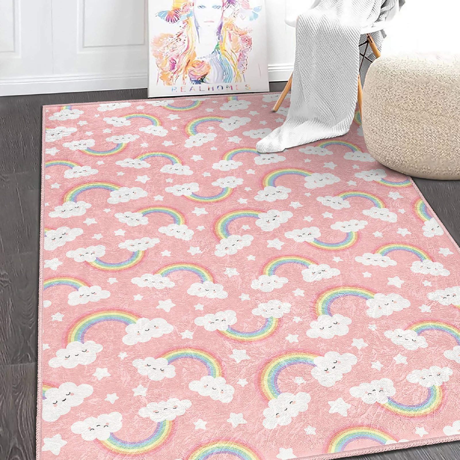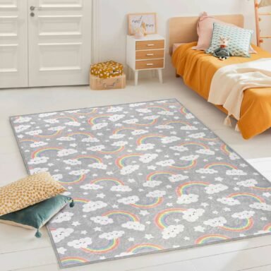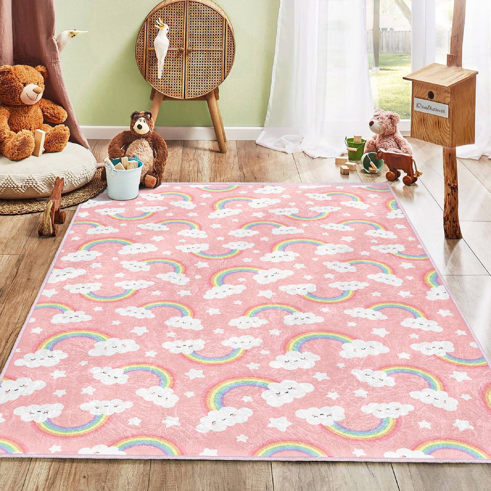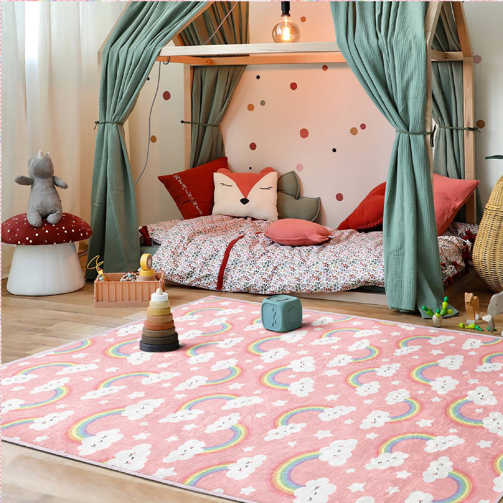 Renkli Gökkuşağı ve Bulut Desenli Yıkanabilir Kaymaz Taban Çocuk Halısı