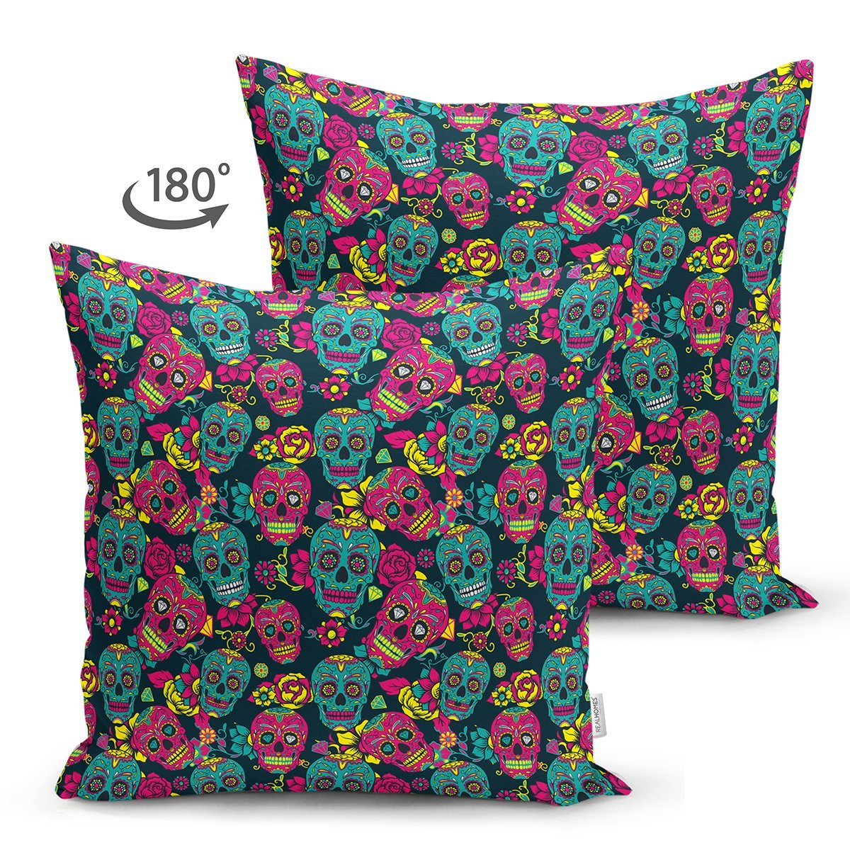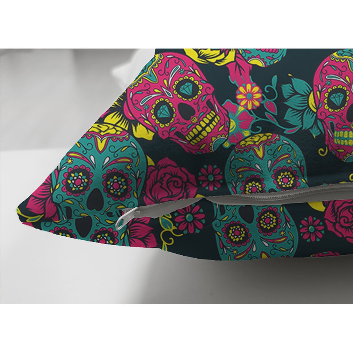 Renkli İskelet Ve Gül Figürlü Özel Tasarım Dijital Baskılı Modern Süet Yastık Kırlent Kılıfı