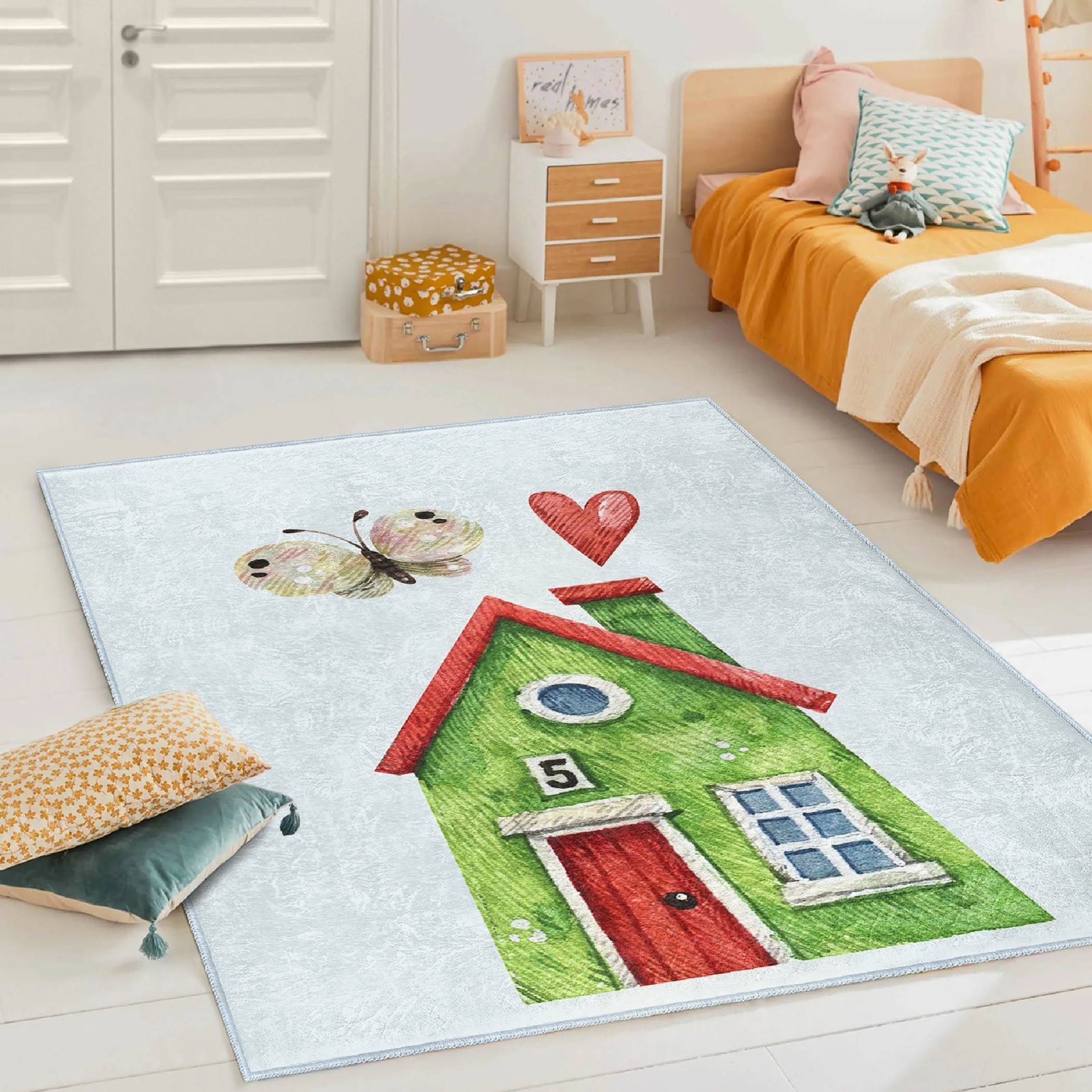 Renkli Kelebek ve Ev Motifli Dikdörtgen Çocuk Halısı – Kaymaz Taban ile Güvenli Oyun Alanı İçin