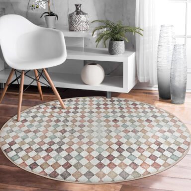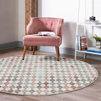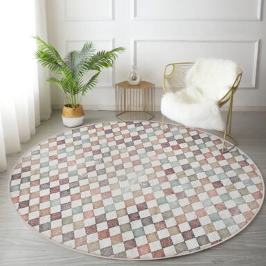 Renkli Viskon Geometrik Desenli Yuvarlak Salon Halısı – Yıkanabilir Kaymaz Tabanlı 8mm Süngerli