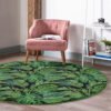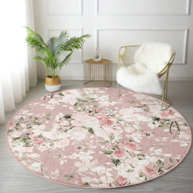 Renkli Zeminde Beyaz Çiçek Desenli Pembe Salon Oturma Odası Yıkanabilir Kaymaz Tabanlı Yuvarlak Halı