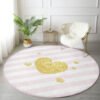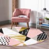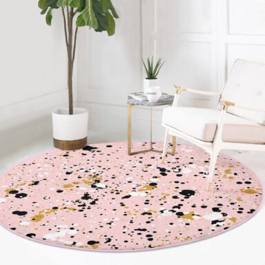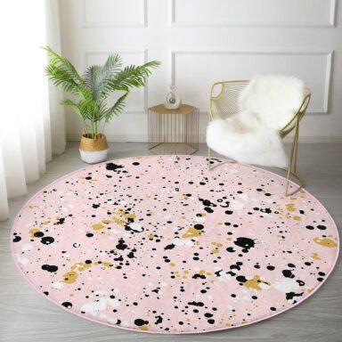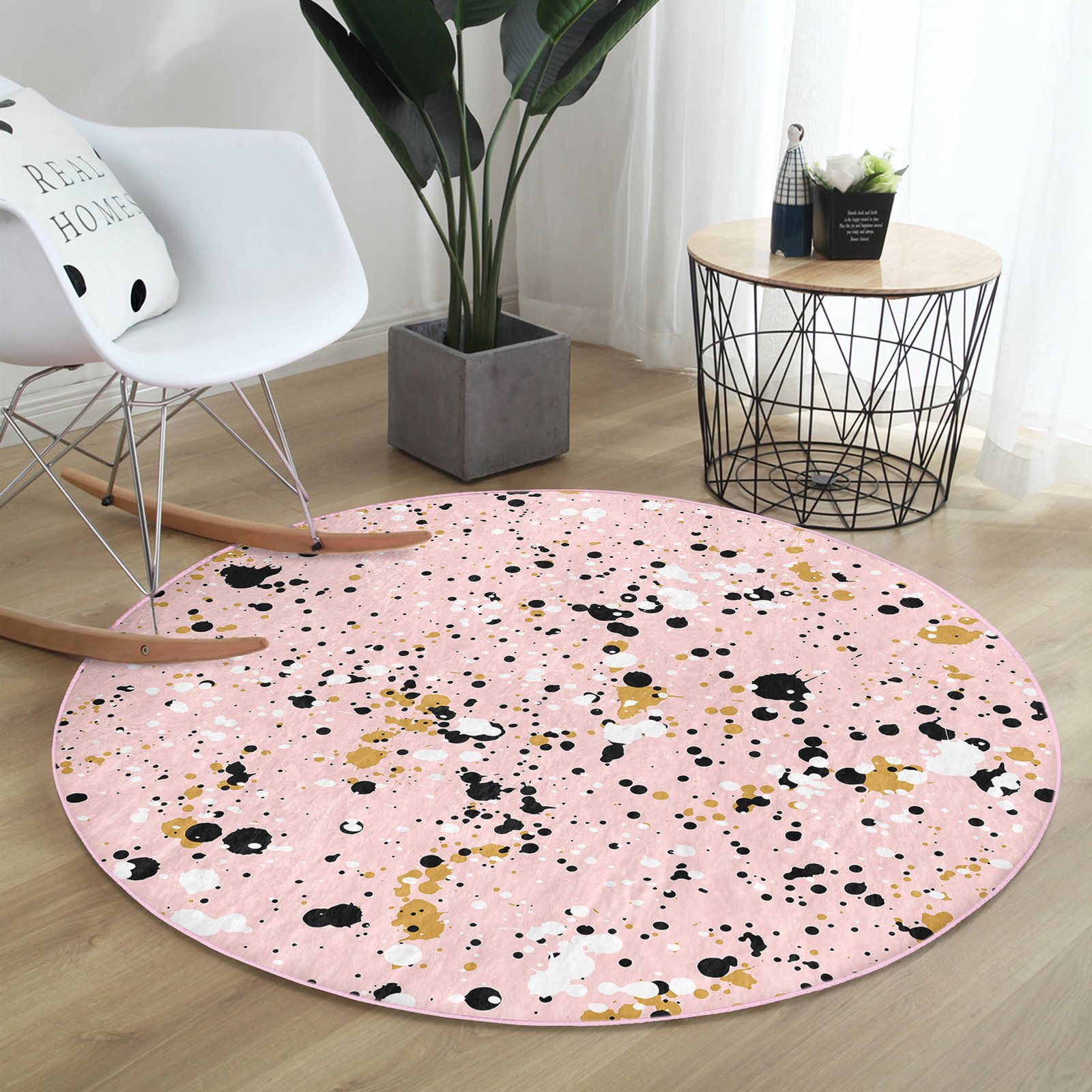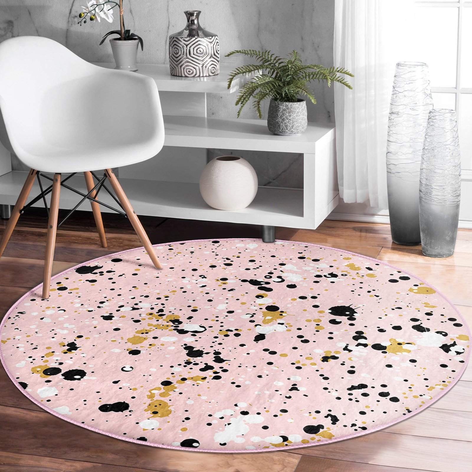 Renkli Zeminde Gold Detaylı Siyah Puantiyeli Pembe Mutfak Yıkanabilir Kaymaz Tabanlı Yuvarlak Halı