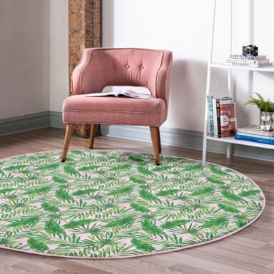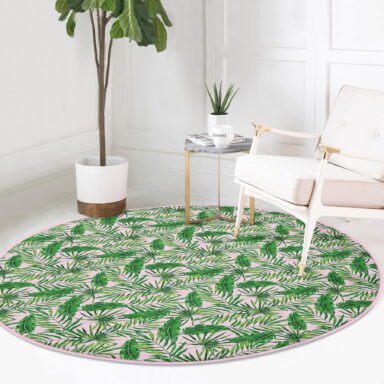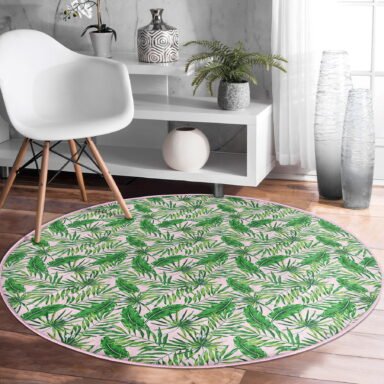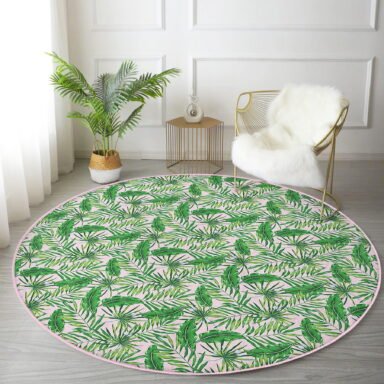 Renkli Zeminde Yaprak Desenli Yeşil Salon Ve Oturma Odası Yıkanabilir Kaymaz Tabanlı Yuvarlak Halı