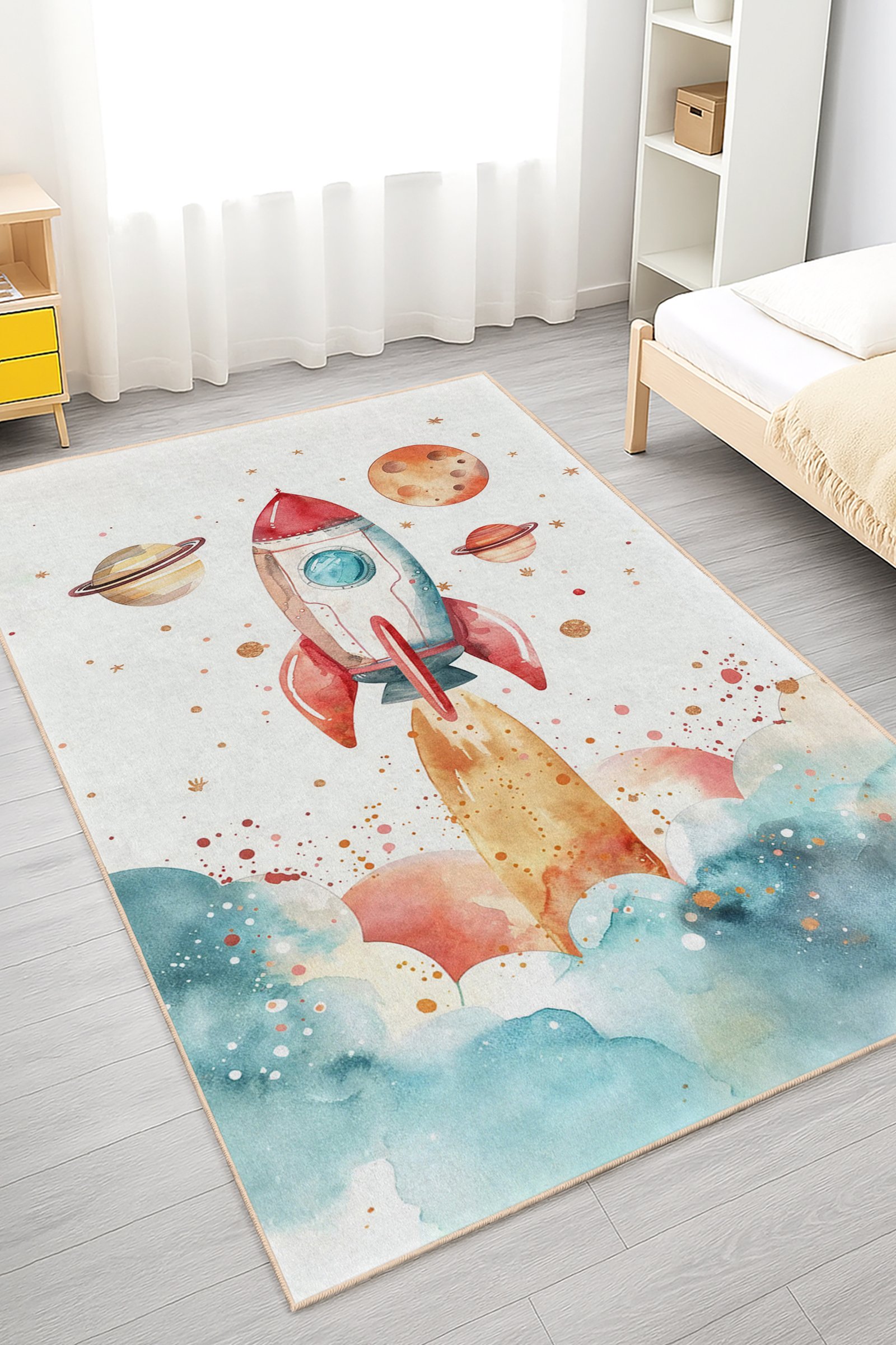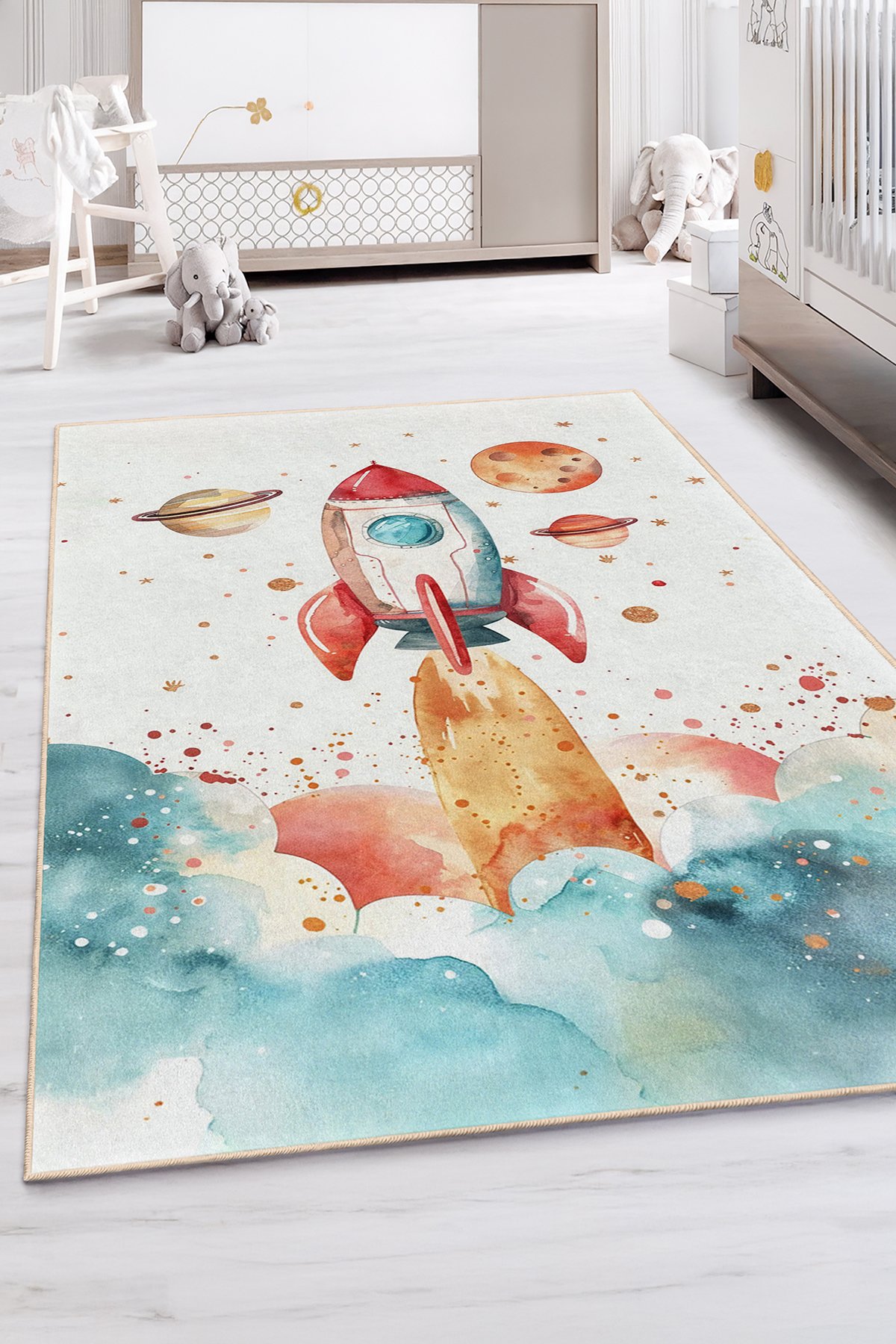 Roket ve gezegenler desenli bu uzay temalı beyaz çocuk odası halısı, su boyası dokulu mavi, turuncu ve kırmızı tonlarıyla minik kaşiflerin hayal gücünü ateşleyen neşeli bir atmosfer oluşturur. Gökyüzüne fırlayan roket, etrafındaki gezegenler ve yumuşak bulut geçişleriyle odada macera ve keşif duygusunu öne çıkarırken, sıcak renklerin dengelendiği açık zemin ferah ve aydınlık bir görünüm sağlar. Hem kız hem erkek çocuk odalarına uyum sağlayan bu çocuk odası halısı, oyun alanına uzay yolculuğu temalı eğlenceli bir hava katarken, rahat dokusuyla odada güvenli ve konforlu bir oyun ortamı sunar.