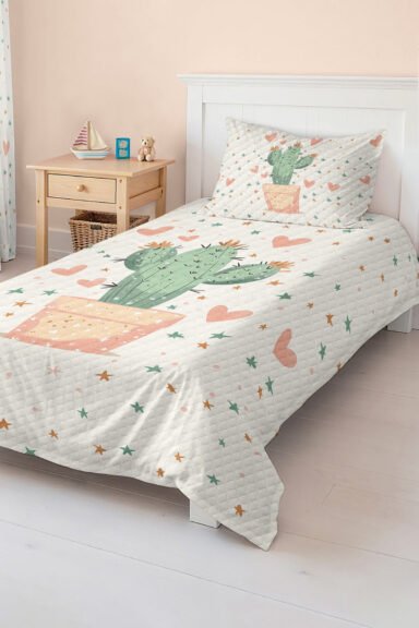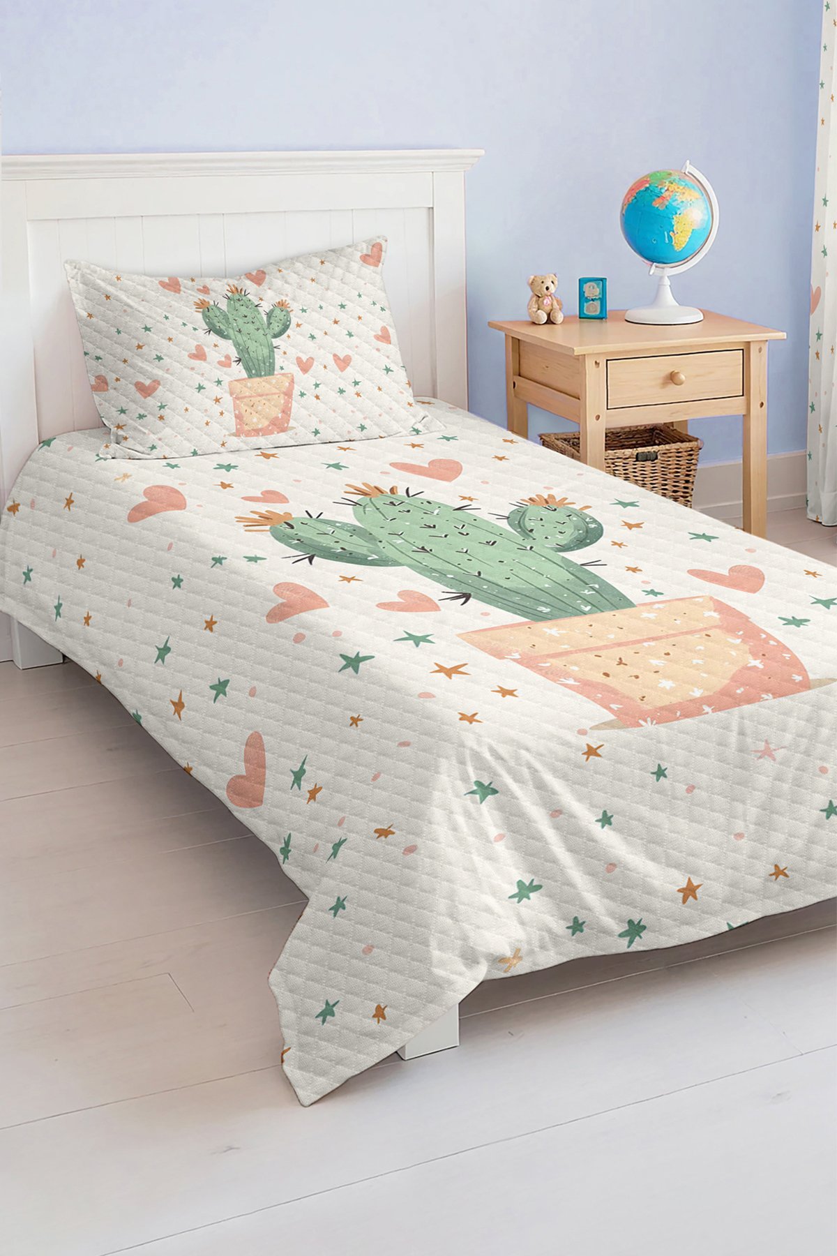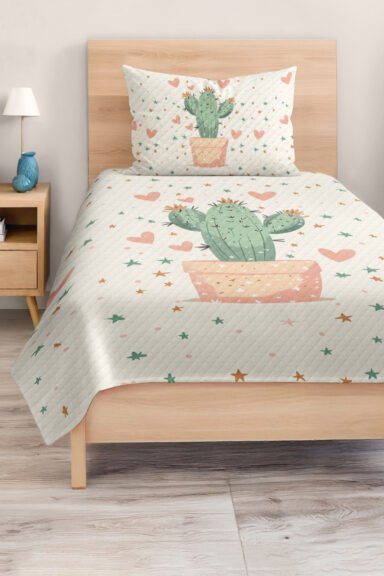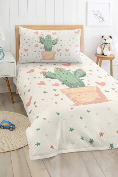 Bu sevimli kaktüs ve yıldız desenli tek kişilik pike takımı, çocuk ve genç odaları için ideal seçimdir. Hem estetik hem fonksiyonel özellikleriyle çocukların rahat bir uyku deneyimi yaşamalarını sağlar.