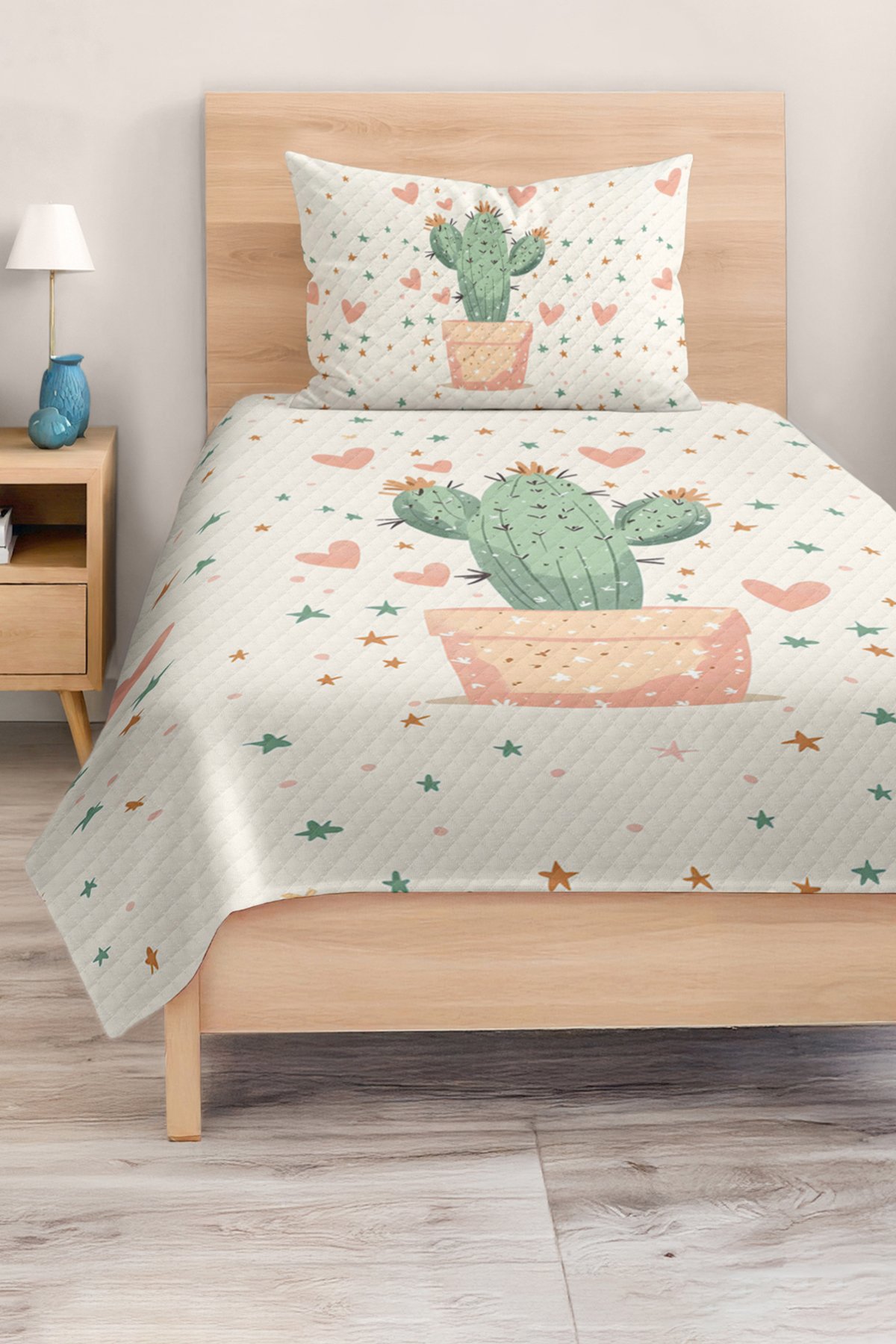 Sevimli Kaktüs ve Yıldız Desenli Tek Kişilik Çocuk ve Genç Odası Pike Takımı