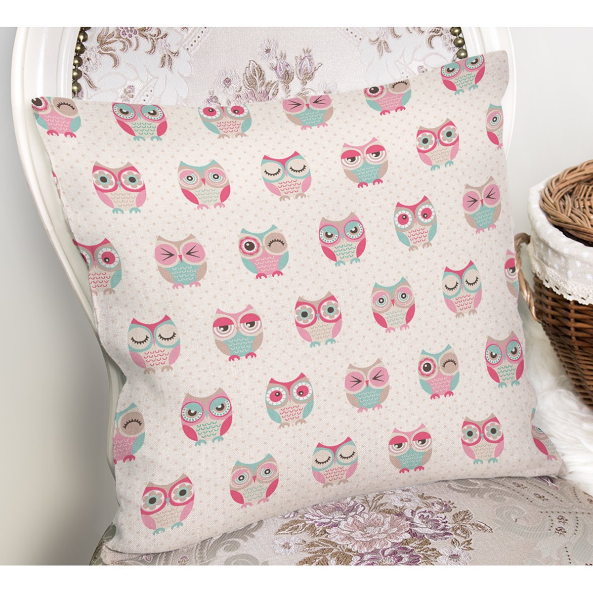 Sevimli Pembe Baykuşlar Temalı Dijital Baskılı Özel Tasarım Modern Yastık Kırlent Kılıfı