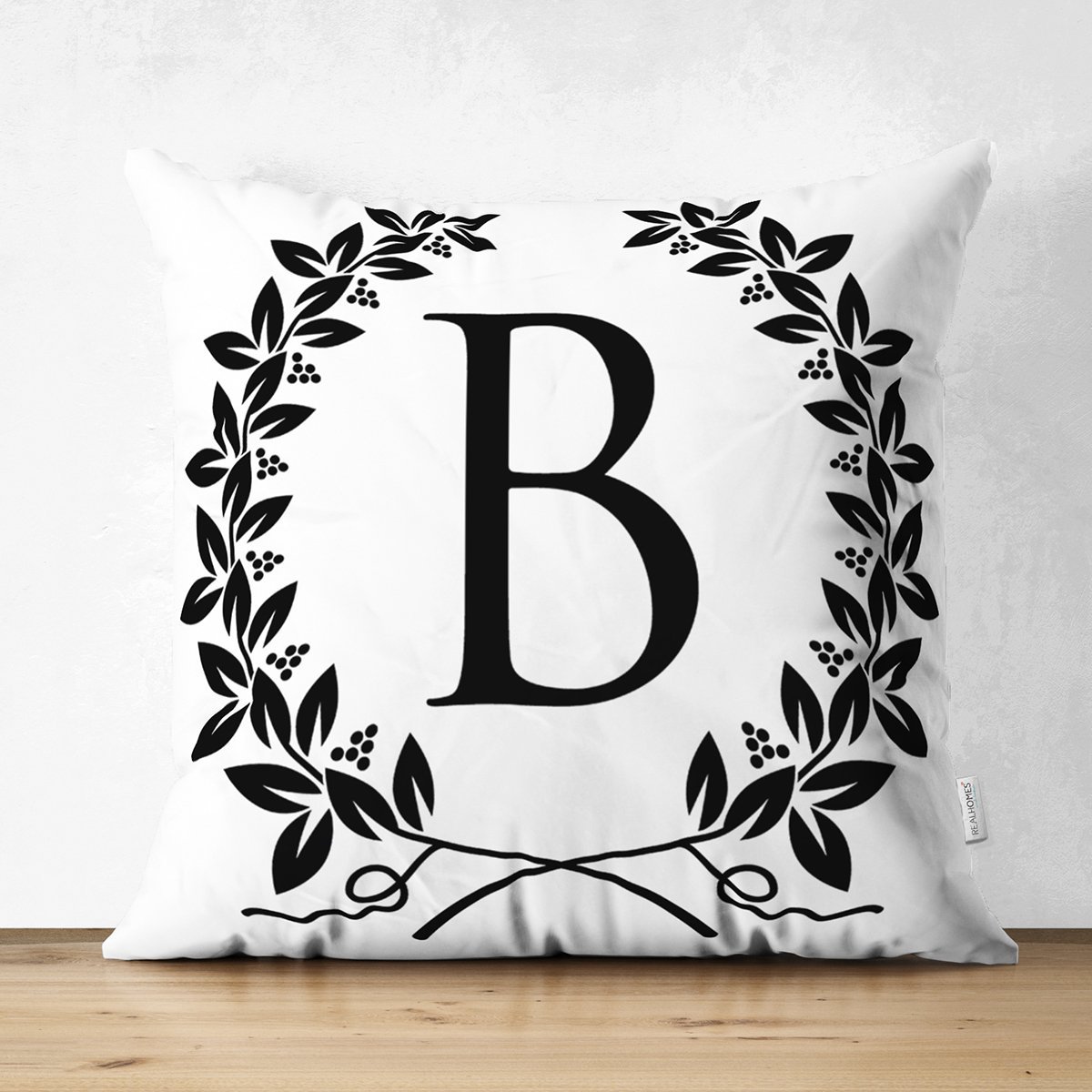 Siyah Beyaz Çelenkli B Harfi Özel Tasarım Modern Suet Yastık Kırlent Kılıfı