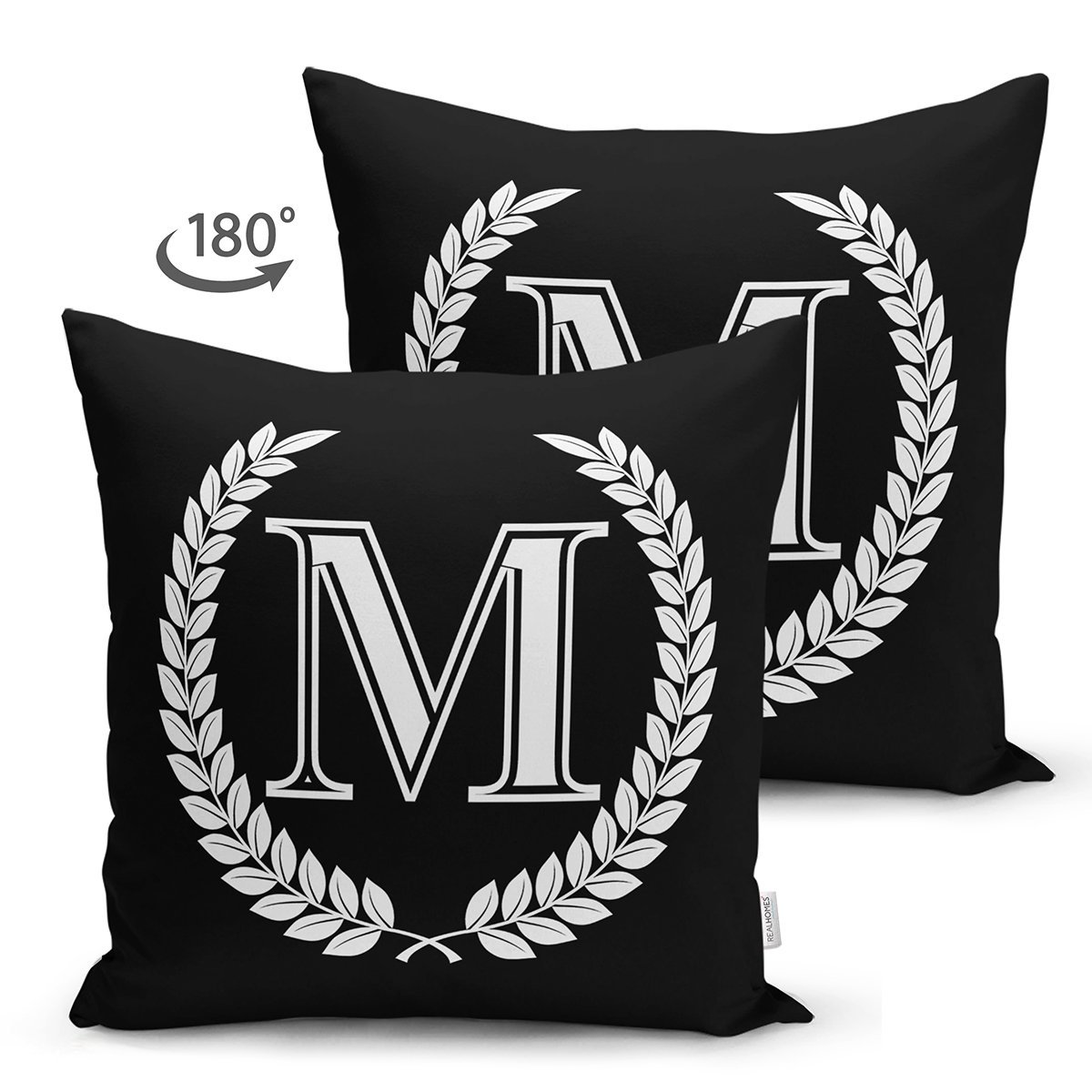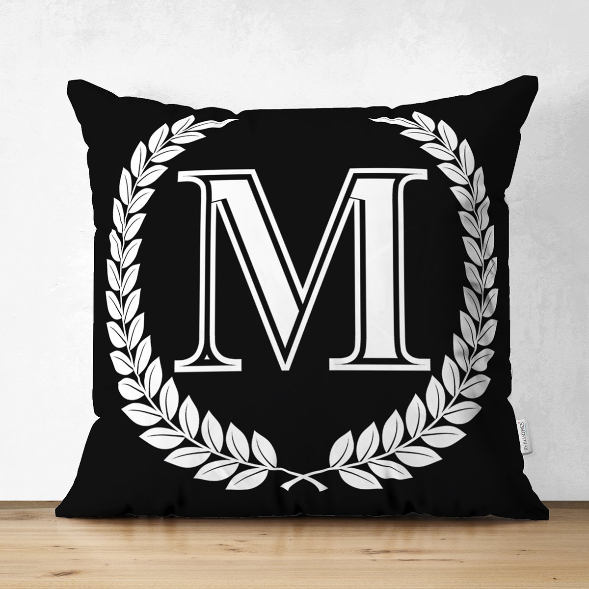 Siyah Beyaz Çelenkli M Harfi Özel Tasarım Modern Suet Yastık Kırlent Kılıfı