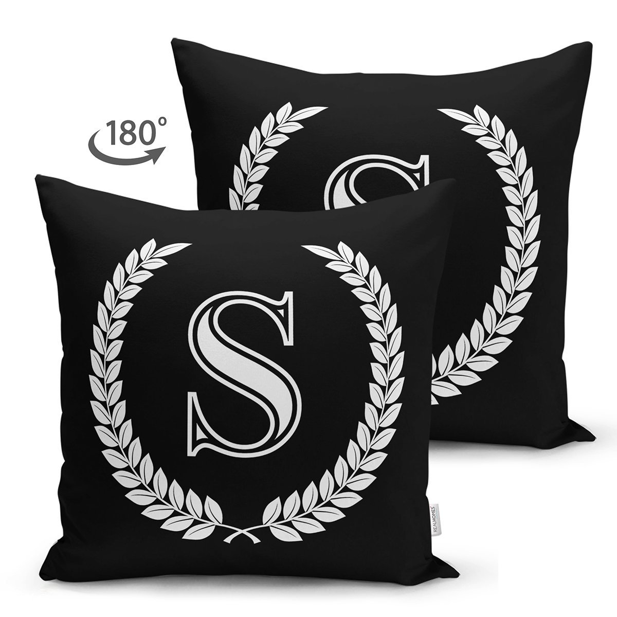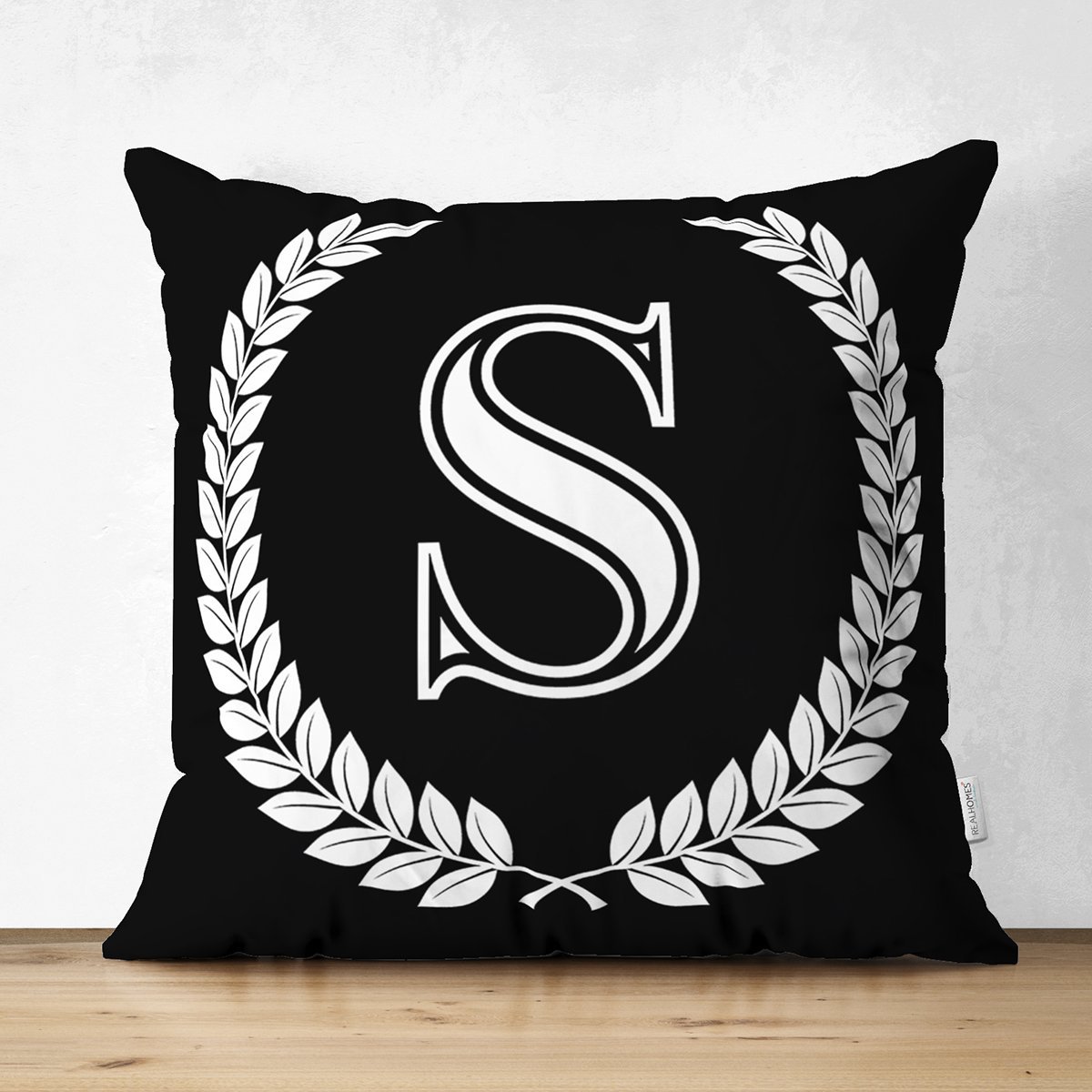 Siyah Beyaz Çelenkli S Harfi Özel Tasarım Modern Suet Yastık Kırlent Kılıfı