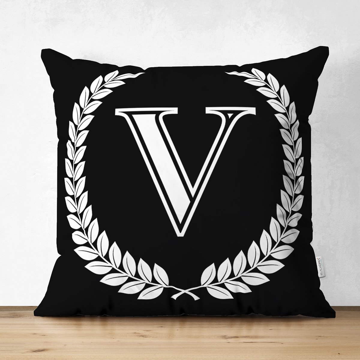 Siyah Beyaz Çelenkli V Harfi Özel Tasarım Modern Suet Yastık Kırlent Kılıfı
