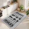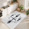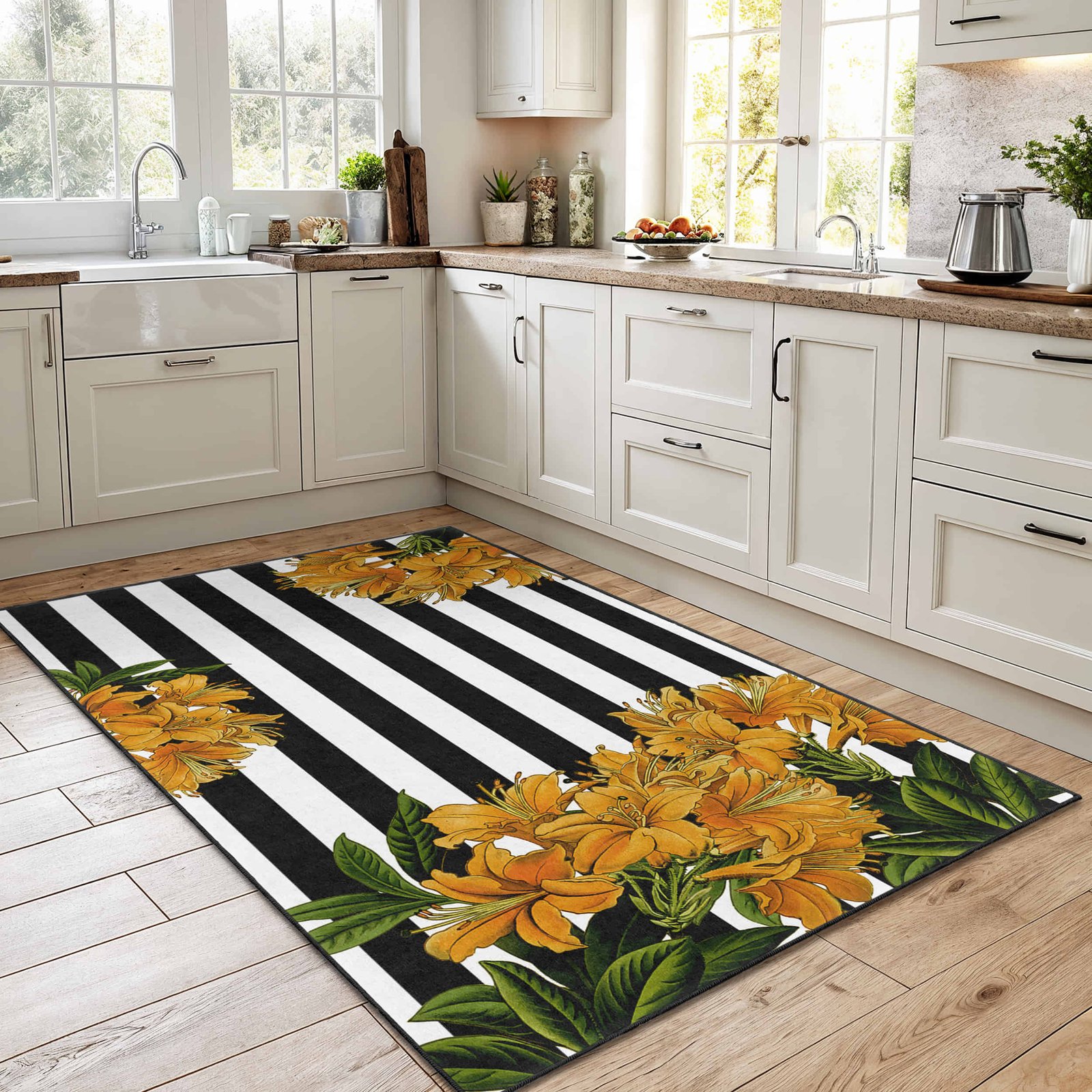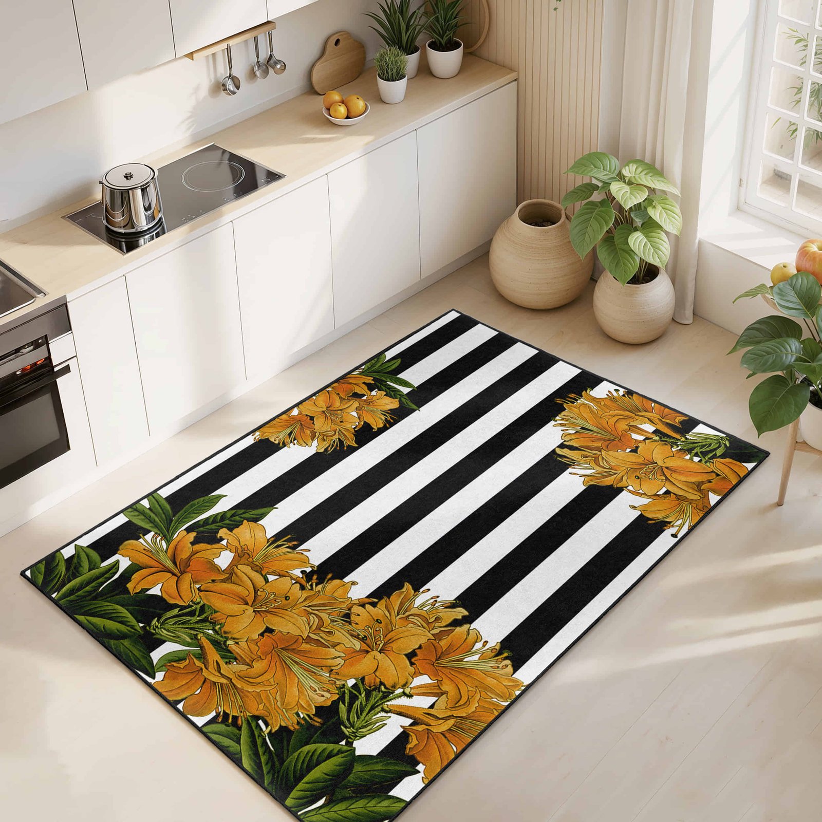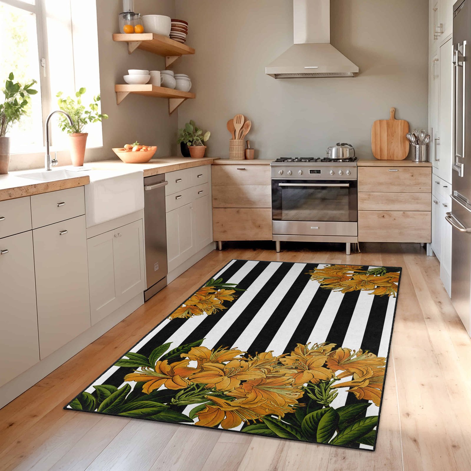 Siyah Beyaz Çizgili Arka Planda Sarı Çiçek Desenli Mutfak Halısı – Yıkanabilir Kaymaz Tabanlı