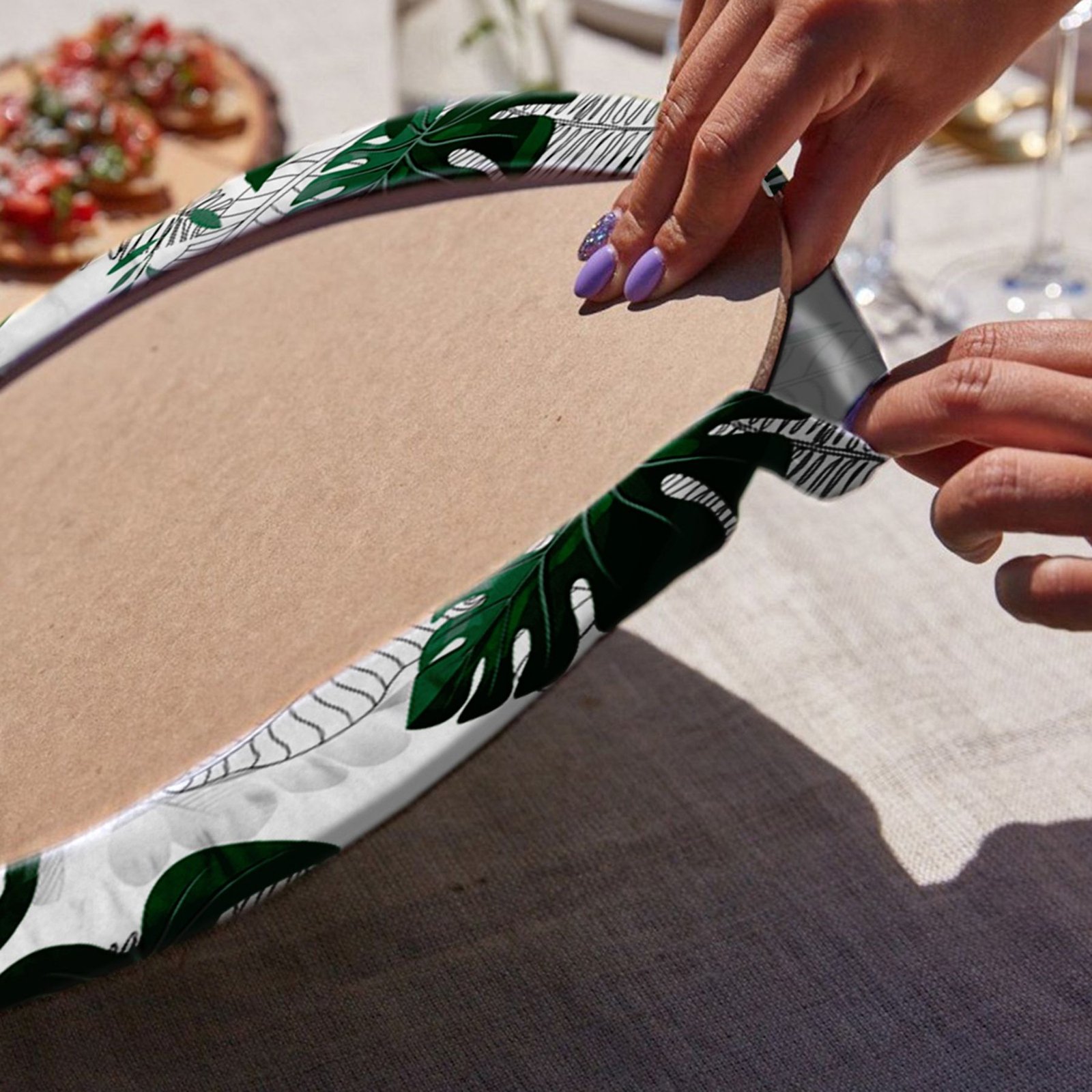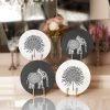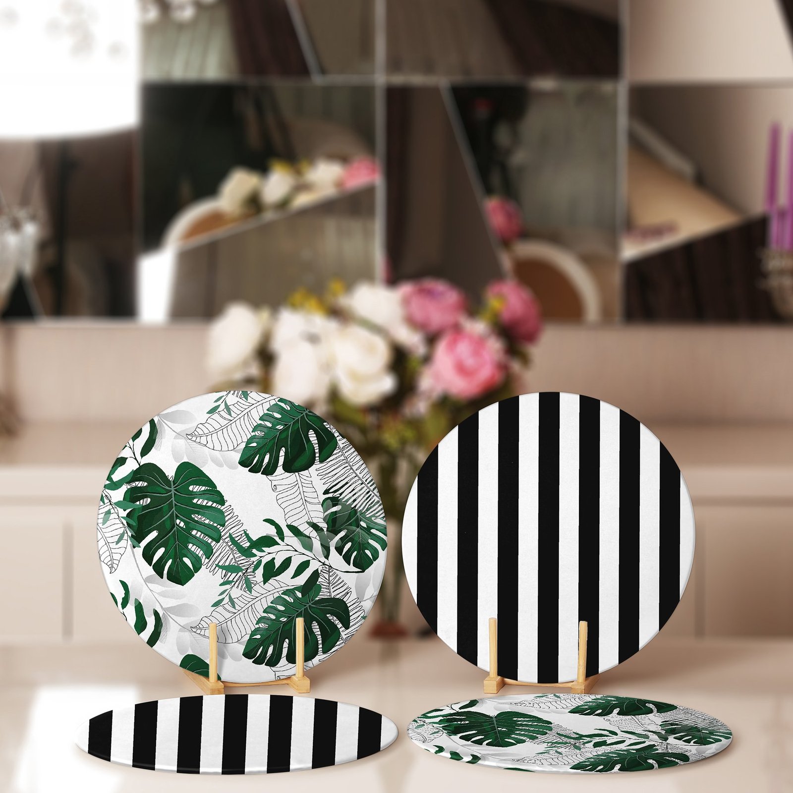 Siyah Beyaz Çizgili Tropik Yapraklar Özel Tasarım Modern Yuvarlak Servis Altlığı & Supla