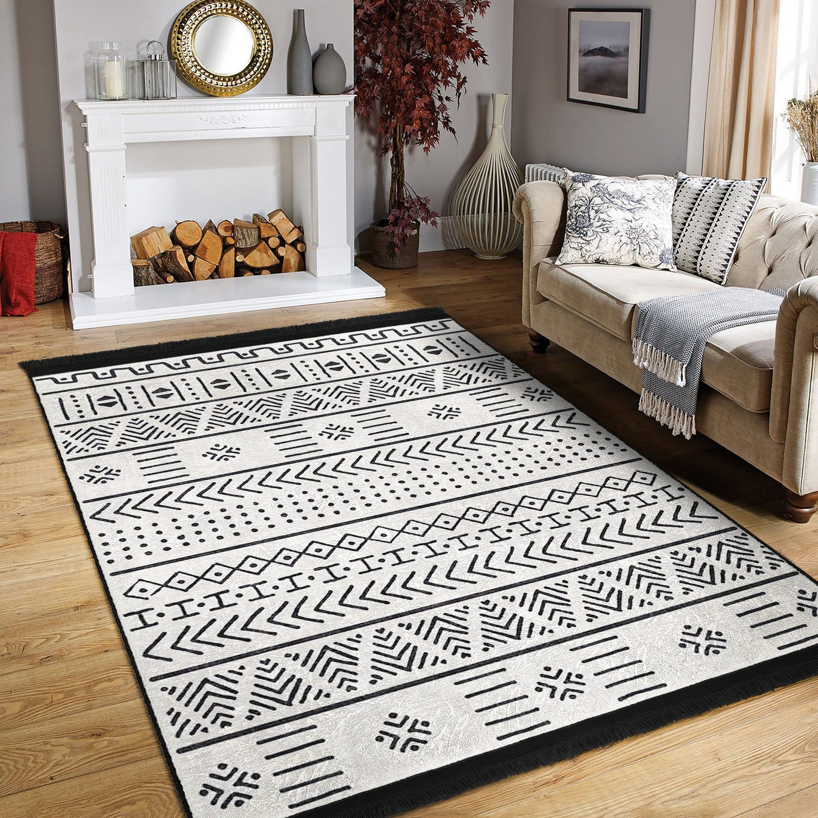 Siyah-beyaz zemin üzerinde etnik geometrik çizgiler, zigzag şeritler, ok ve nokta detaylarıyla tasarlanan bu modern desenli dikdörtgen halı; çocuk ve bebek odalarında sade, ferah ve düzenli bir atmosfer oluştururken salon, yatak odası ve oturma odası dekorasyonuna da güçlü bir minimal vurgu katar. Dijital baskı kalitesiyle desenler net görünür, yıkanabilir yapısı günlük kullanımda pratiklik sağlar ve kaymaz tabanı güvenli bir kullanım sunarak oyun alanlarına konforlu, sıcak bir dokunuş ekler.