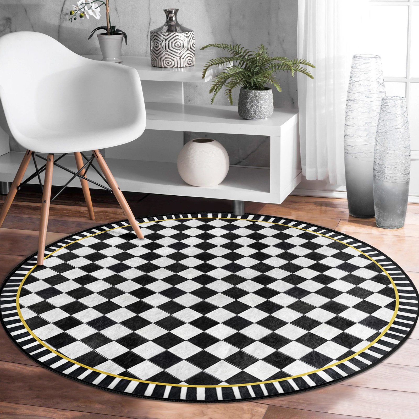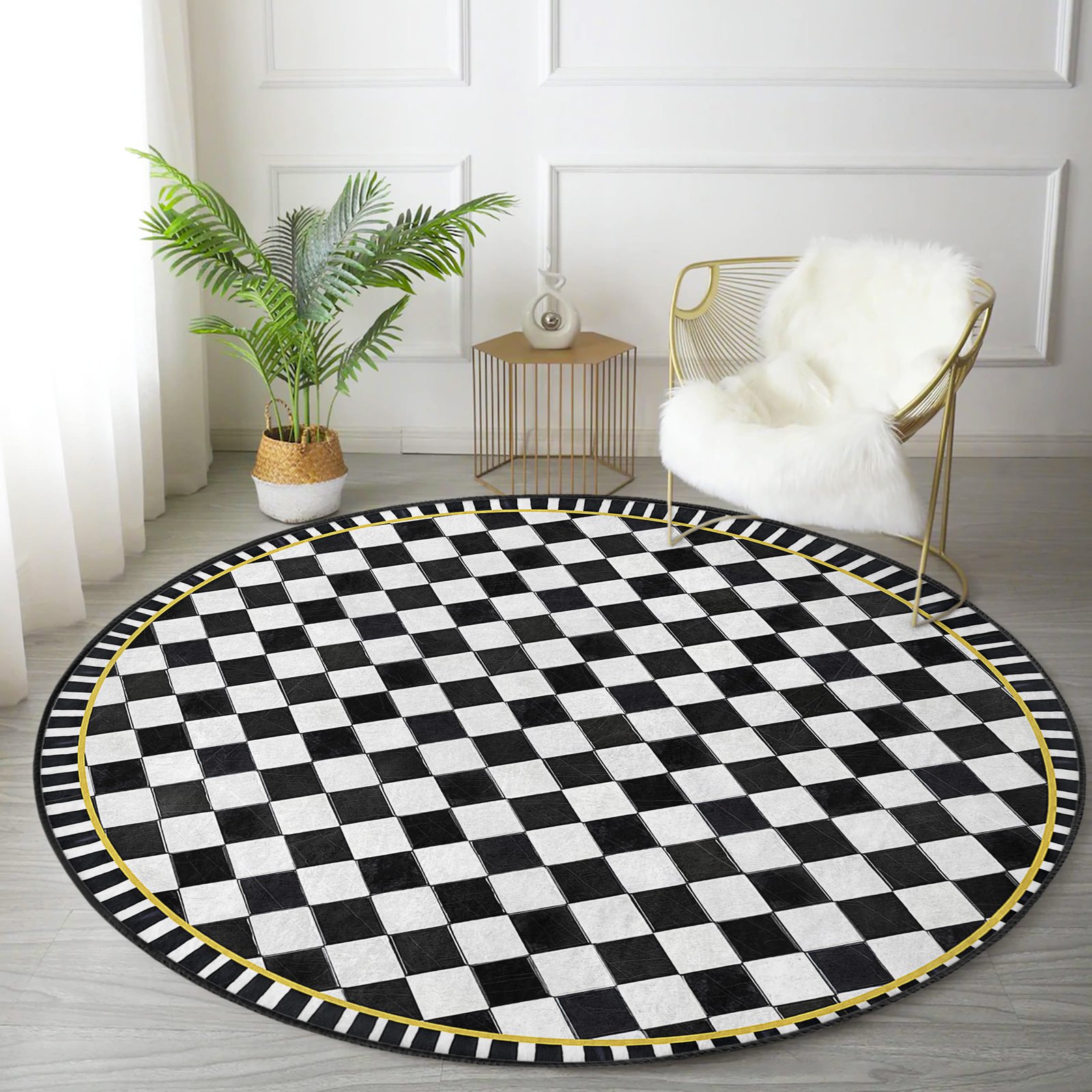 Siyah-Beyaz Kare Desenli Yuvarlak Salon Halısı – Kaymaz Taban ve Yıkanabilir Özellikleriyle Şıklık Sunar