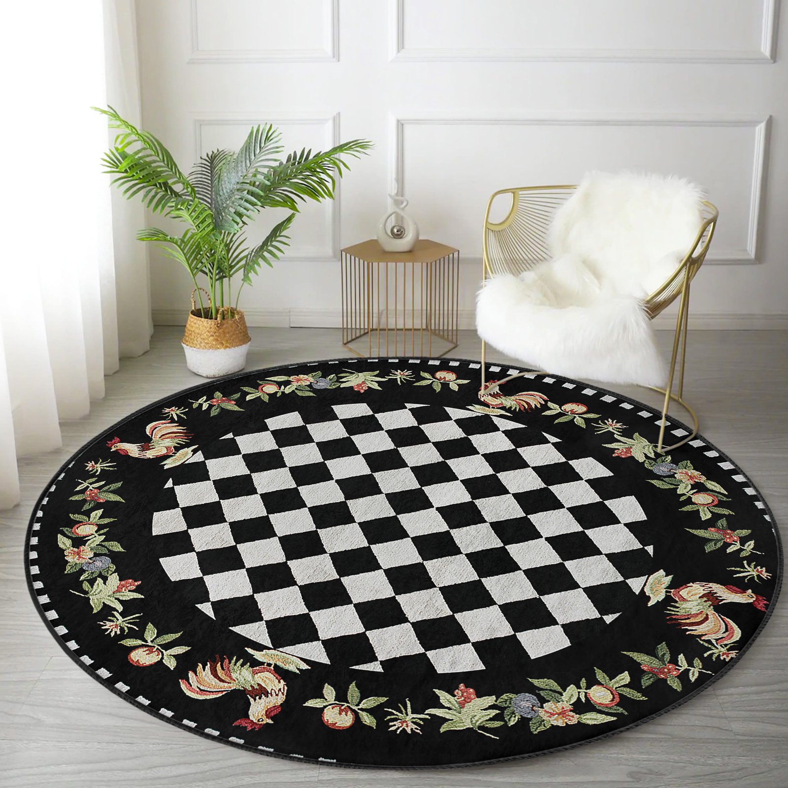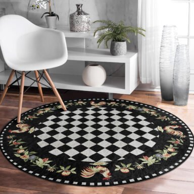Siyah & Beyaz Kare Desenli Yuvarlak Salon Halısı – Şık ve Modern Tasarım ile Yıkanabilir Kaymaz Taban Halı