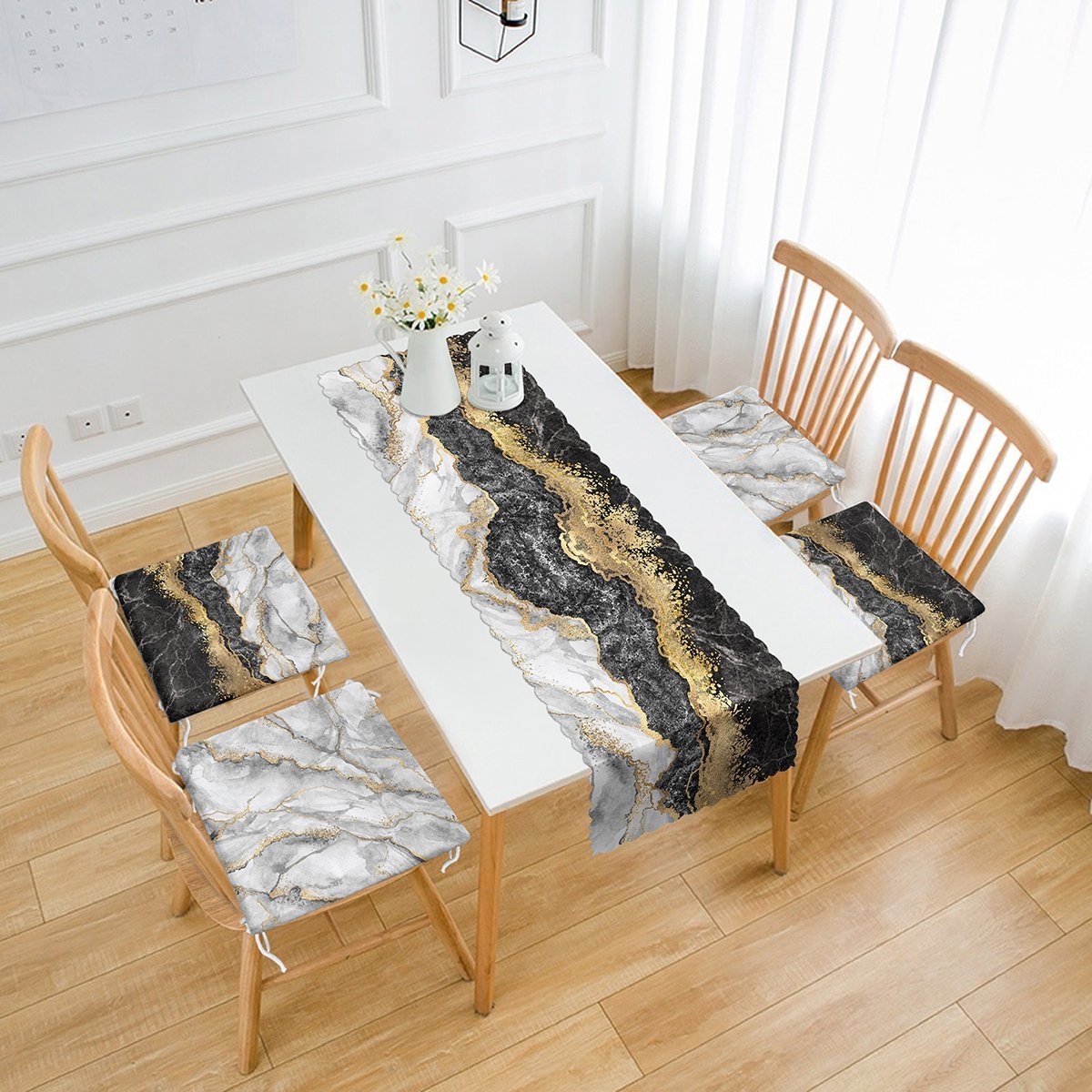 Siyah Mermer Motifli 4 Fermuarlı Sandalye Minderi ve 1 Runner Seti