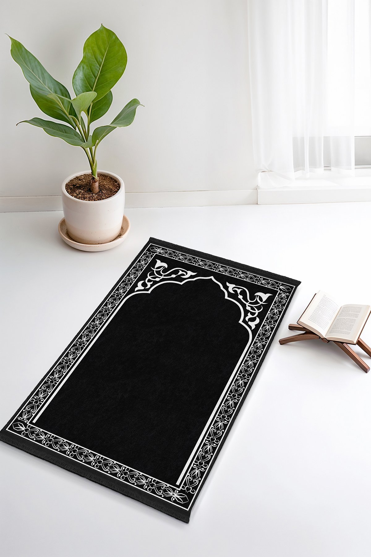 Siyah Minare ve Hat Desenli Dijital Baskılı Kaymaz Tabanlı Namazlık Seccade
