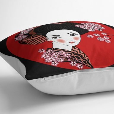 Siyah ve Kırmızı Zeminde Papatya Tasarımlı Japon Kız Modern Yastık Kılıfı