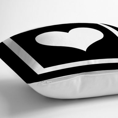 Siyah Zemin Beyaz Çerçeveli Kalp Çizimli Dijital Baskılı Kırlent Kılıfı