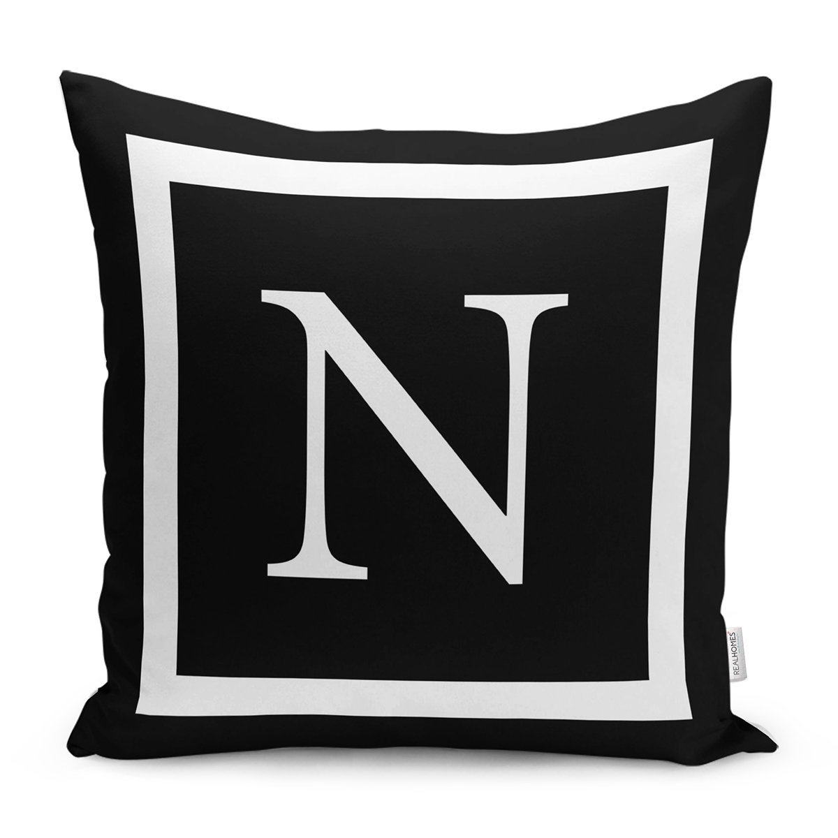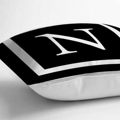Siyah Zemin Beyaz Çerçeveli N Harfi Dijital Baskılı Kırlent Kılıfı