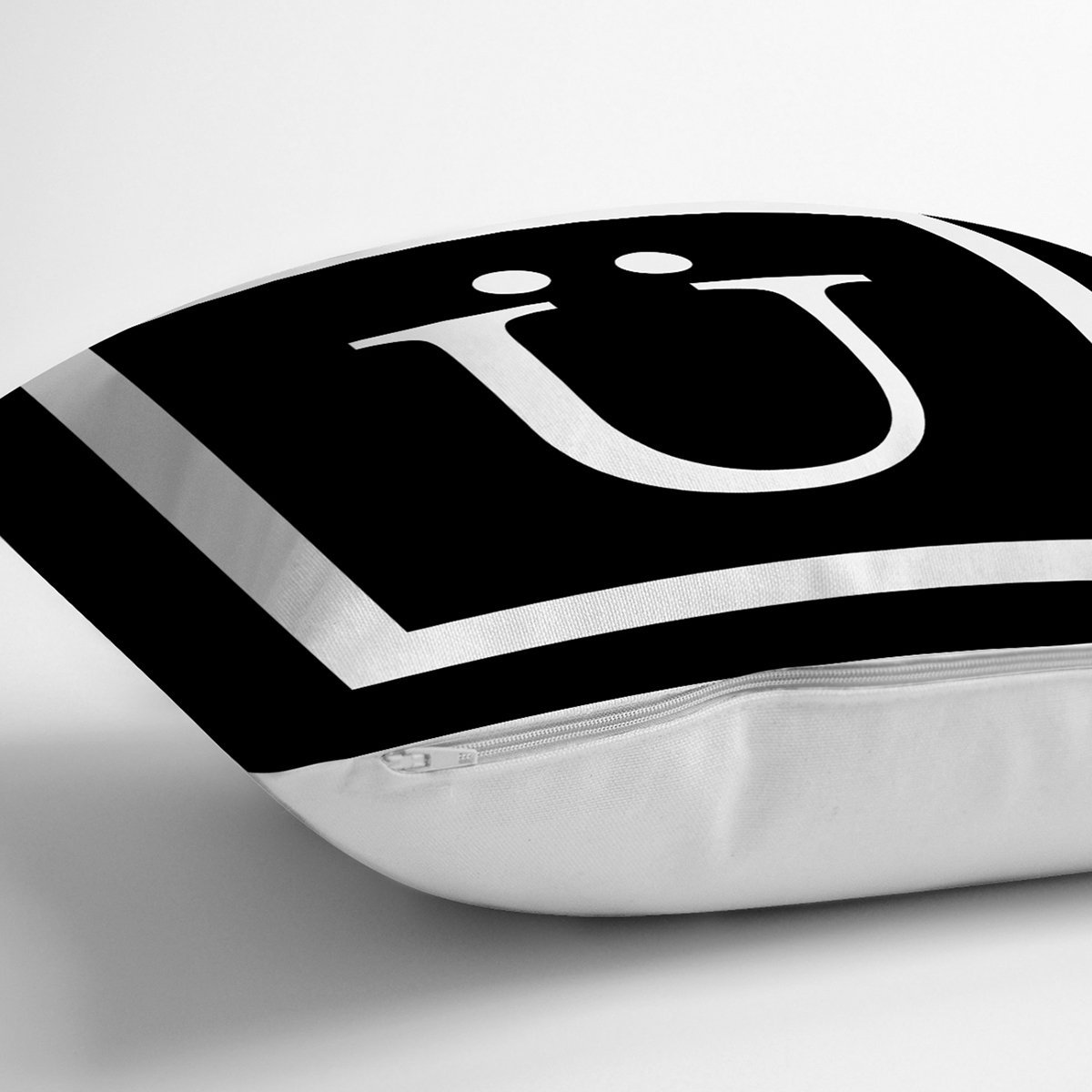 Siyah Zemin Beyaz Çerçeveli Ü Harfi Dijital Baskılı Kırlent Kılıfı