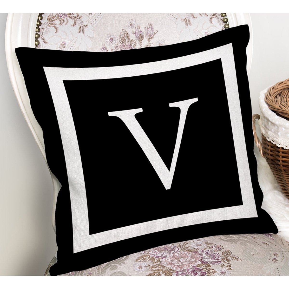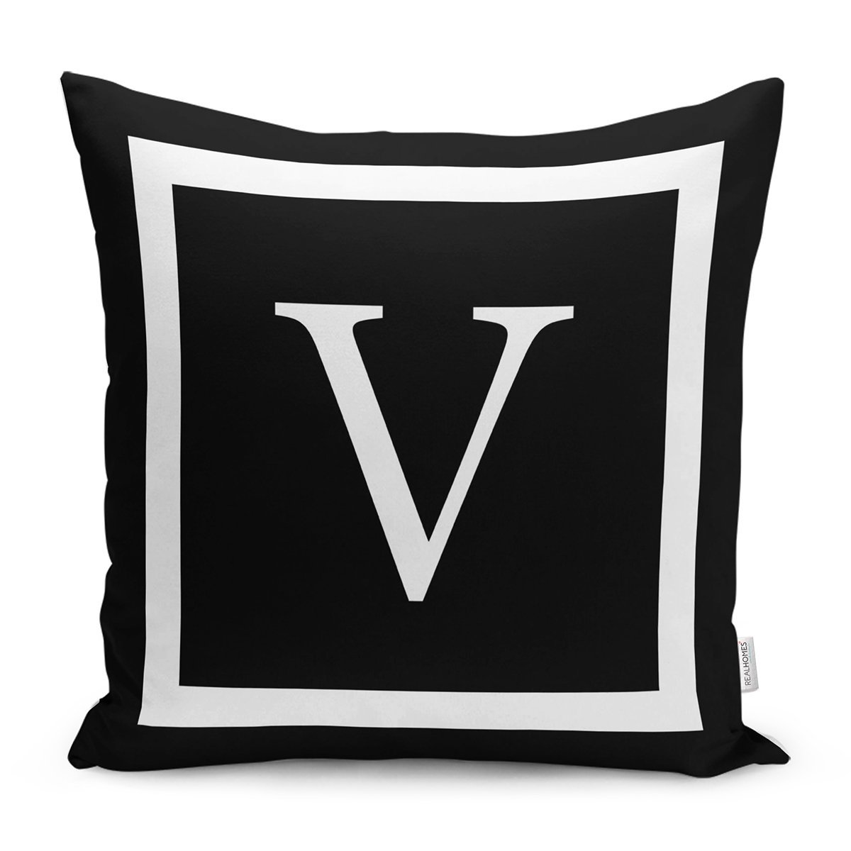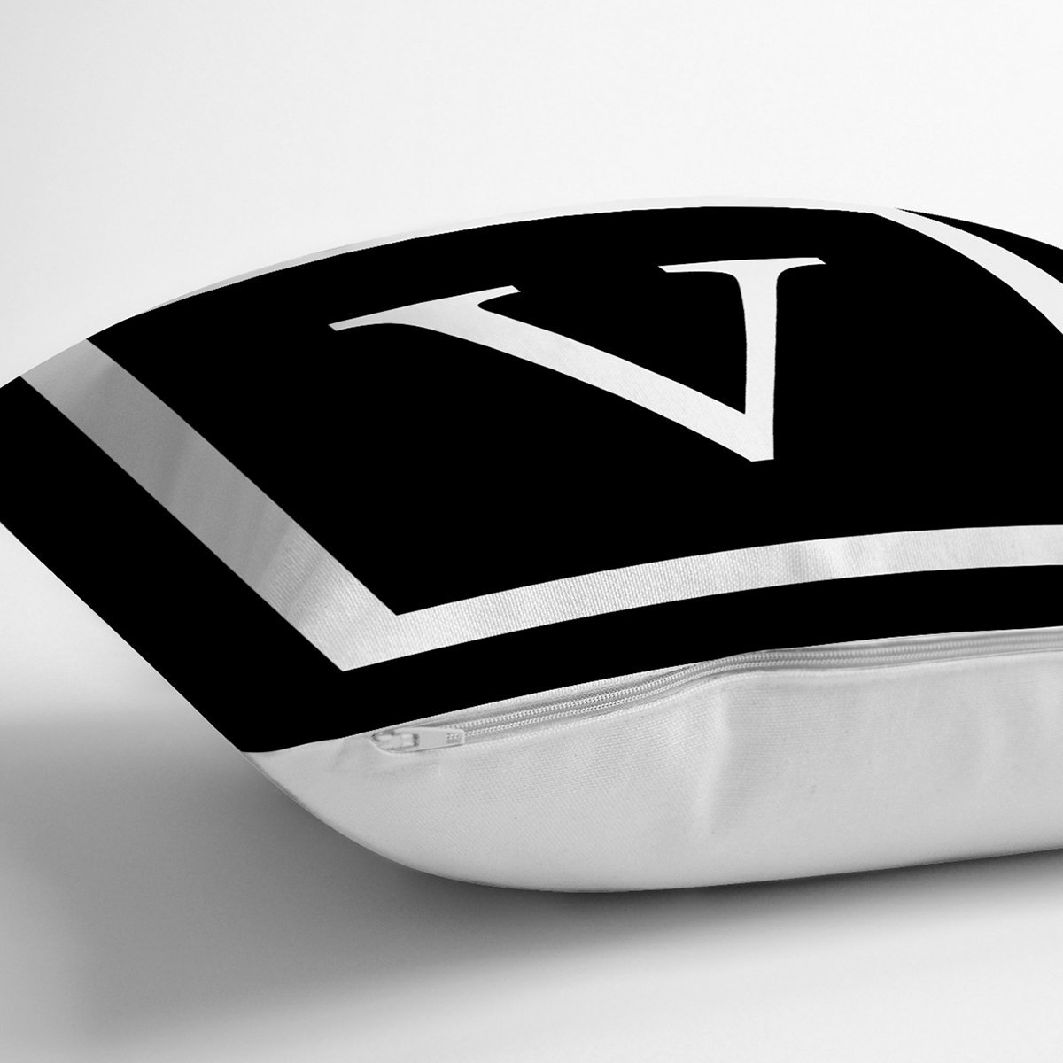 Siyah Zemin Beyaz Çerçeveli V Harfi Dijital Baskılı Kırlent Kılıfı