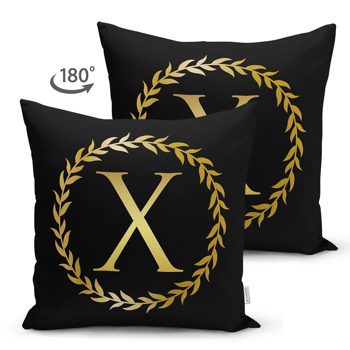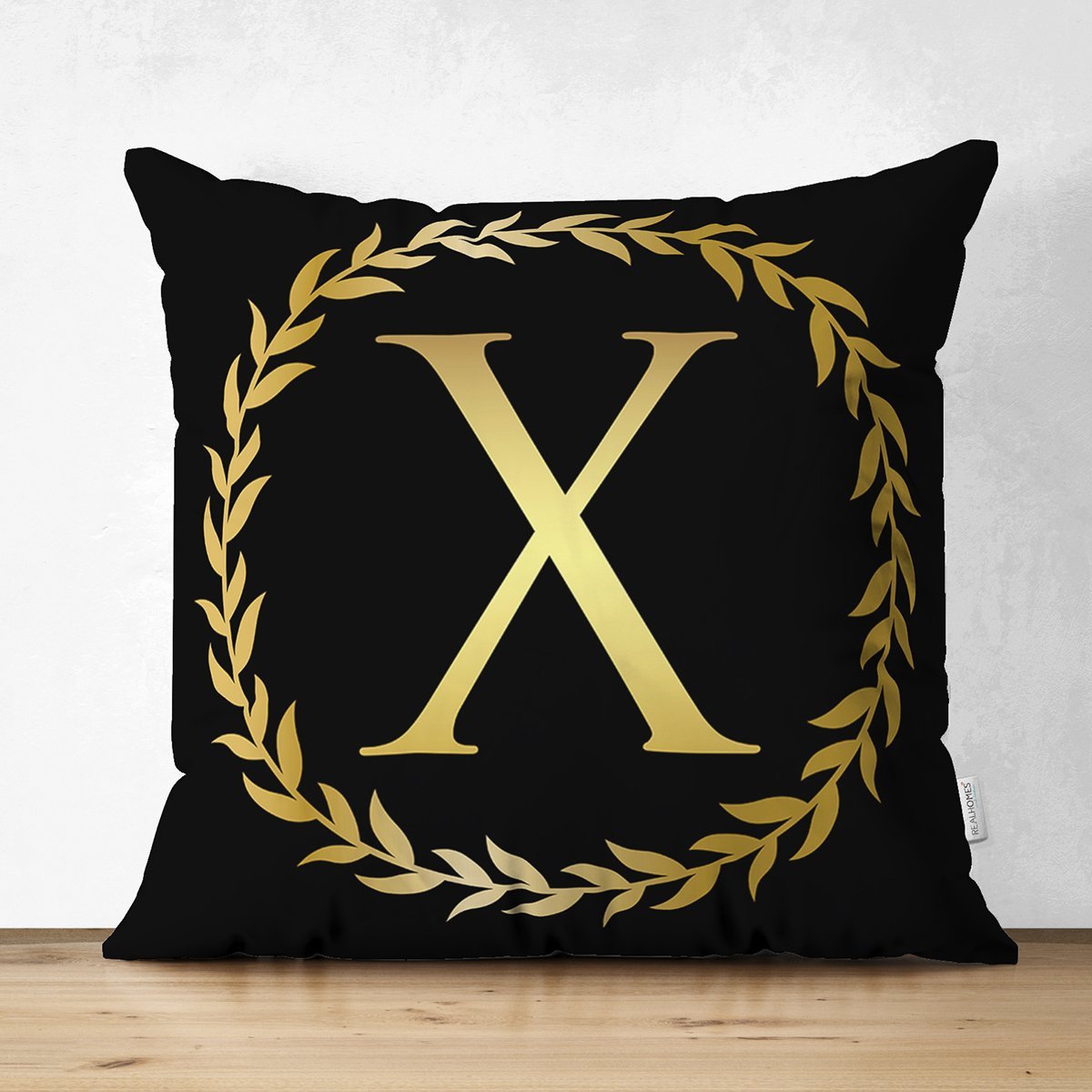 Siyah Zemin Gold Yaprak Çerçeveli X Harfi Özel Tasarım Modern Suet Yastık Kırlent Kılıfı