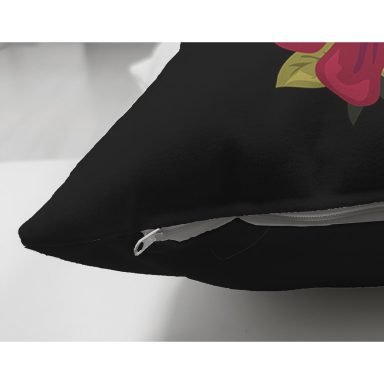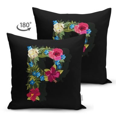 Siyah Zemin Renkli Gül Temalı P Harfi Özel Tasarım Modern Suet Yastık Kırlent Kılıfı