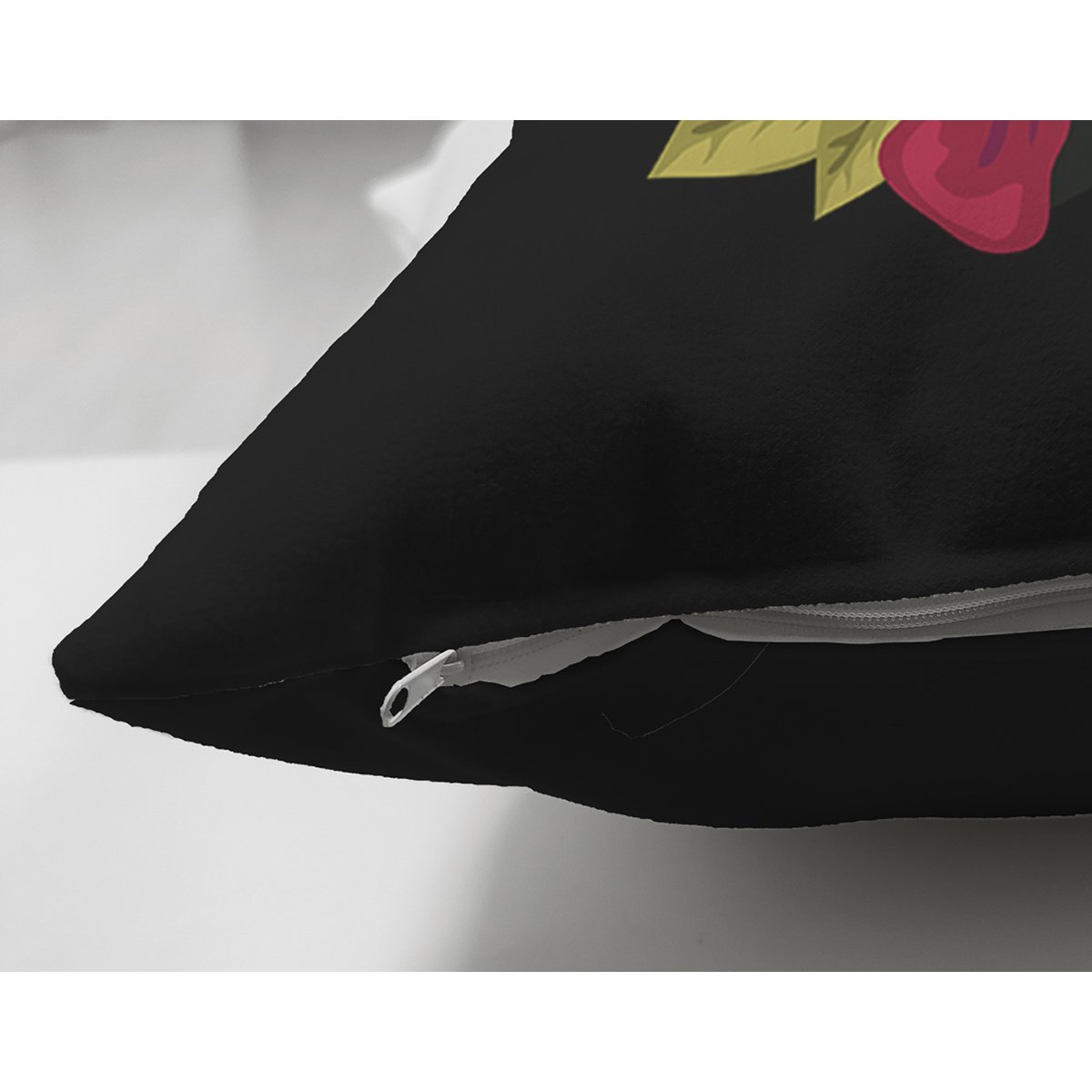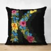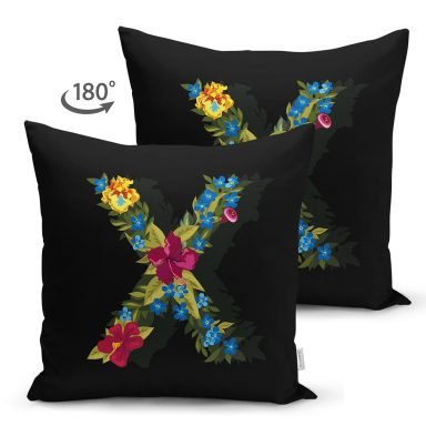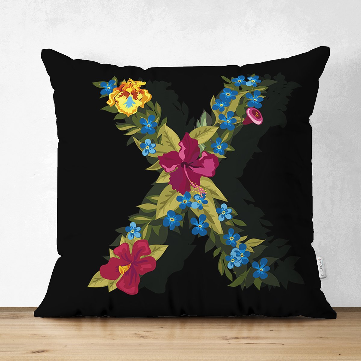Siyah Zemin Renkli Gül Temalı X Harfi Özel Tasarım Modern Suet Yastık Kırlent Kılıfı
