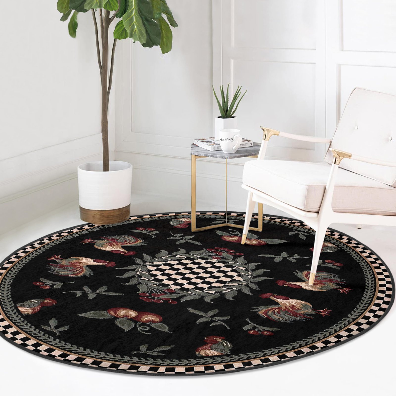 Siyah Zemin Üzerinde Çiçek ve Tavuk Motifli Modern Dijital Baskılı Yuvarlak Salon Halısı