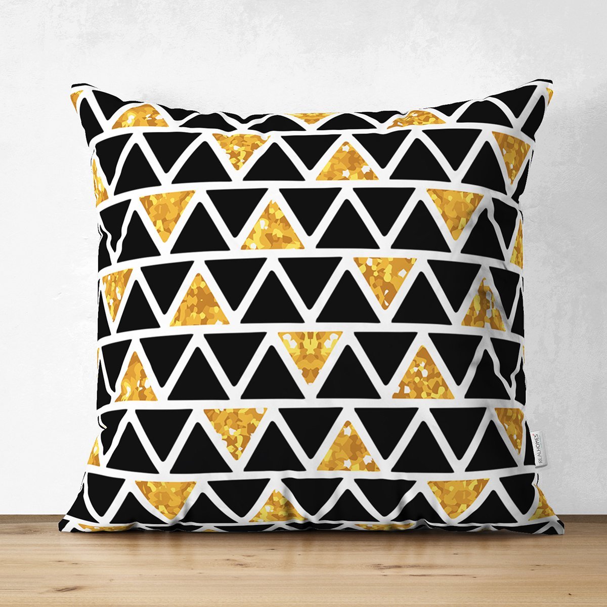 Siyah Zemin Üzerinde Gold Detaylı Geometrik Desenli Dijital Baskılı Modern Süet Yastık Kırlent Kılıfı
