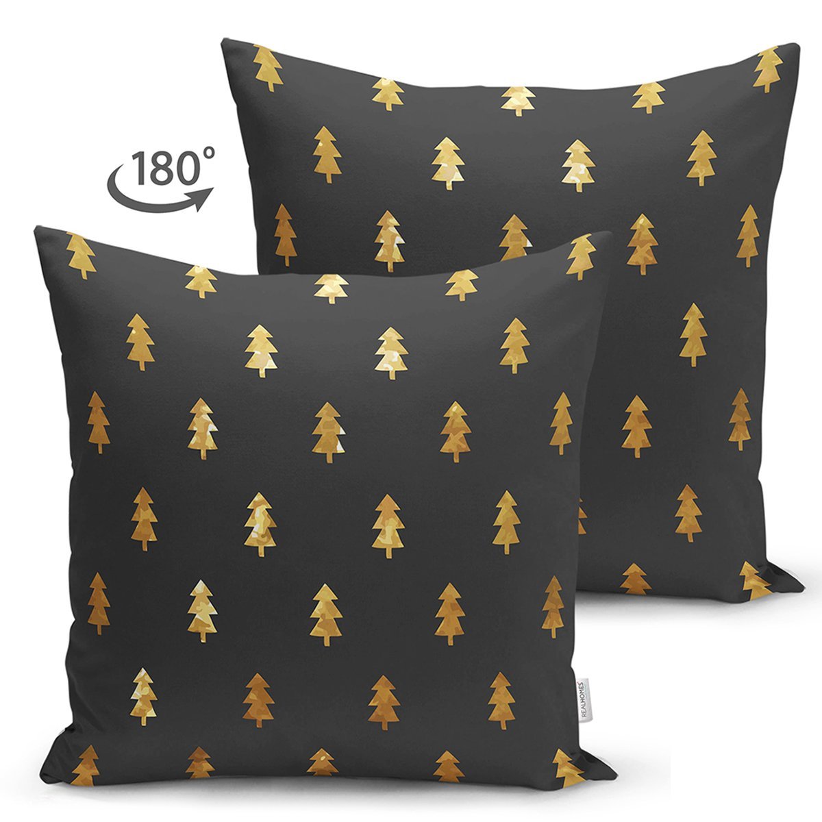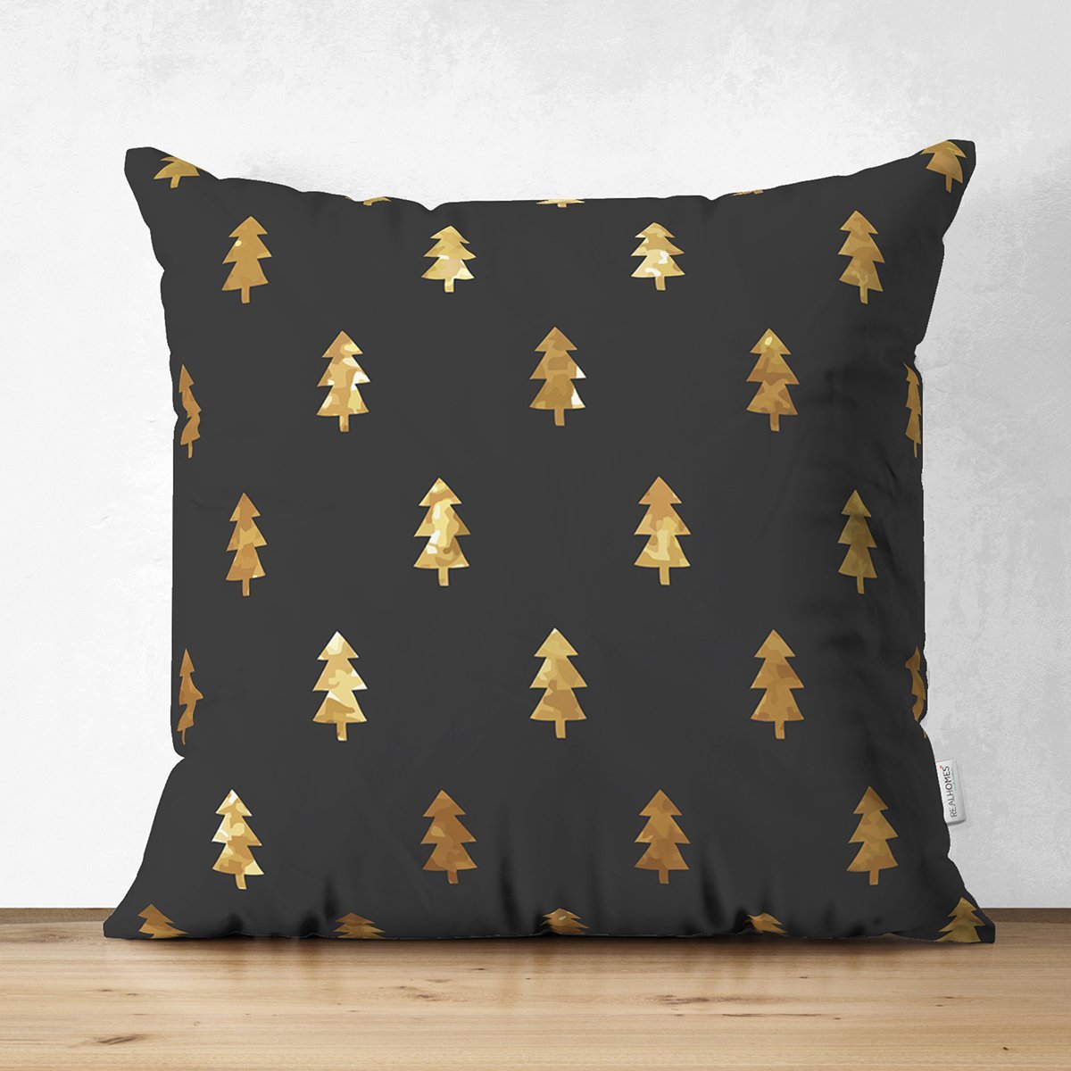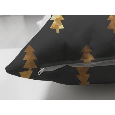 Siyah Zemin Üzerinde Gold Renkli Çam Ağacı Desenli Dijital Baskılı Modern Süet Yastık Kırlent Kılıfı