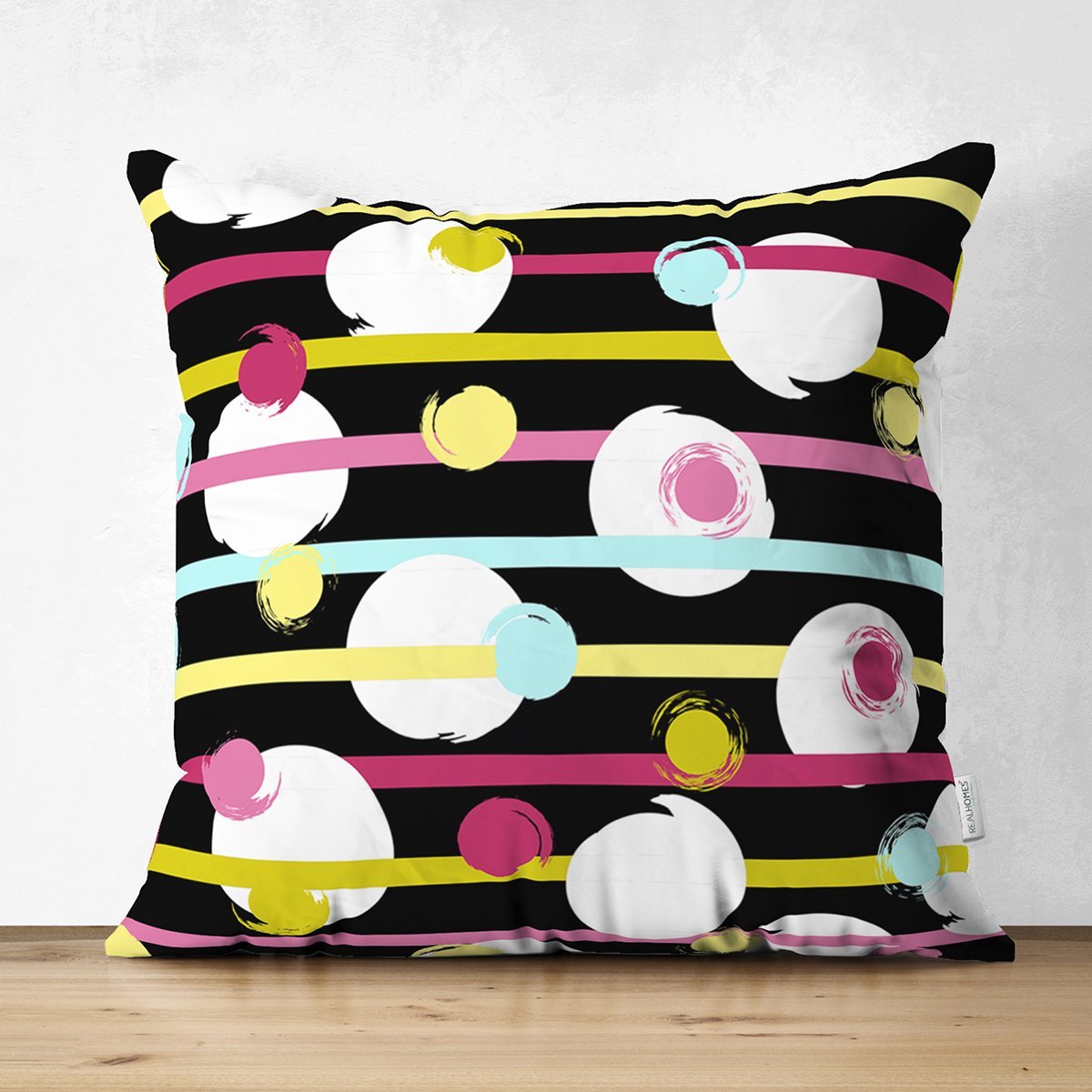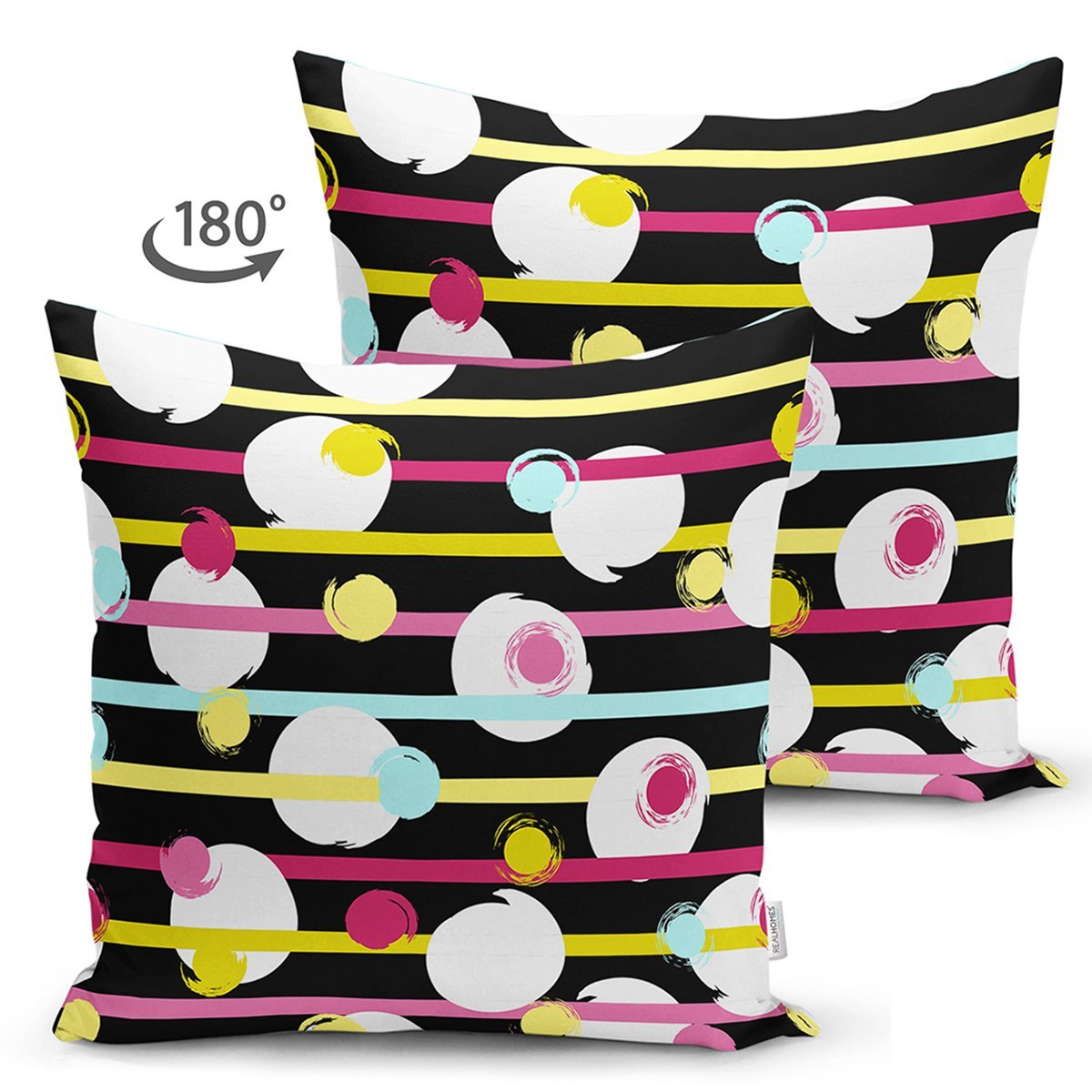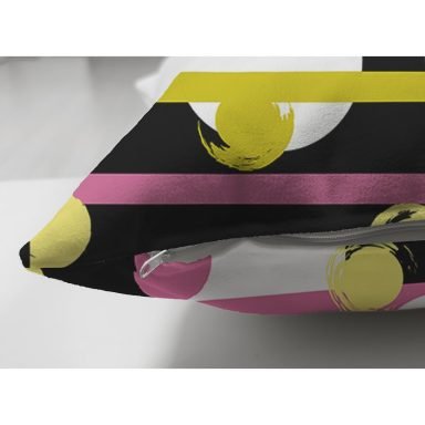 Siyah Zemin Üzerinde Modern Çizgili Beyaz Puantiyeli Dijital Baskılı Modern Süet Yastık Kırlent Kılıfı
