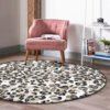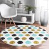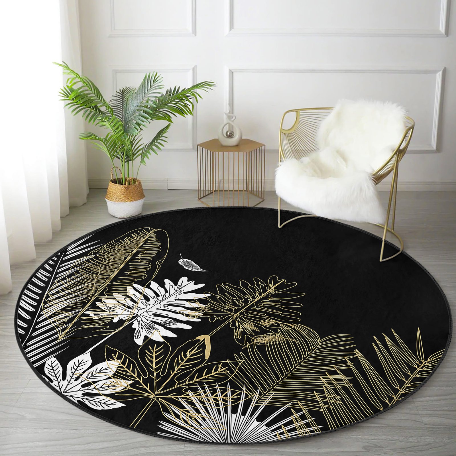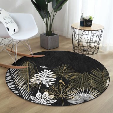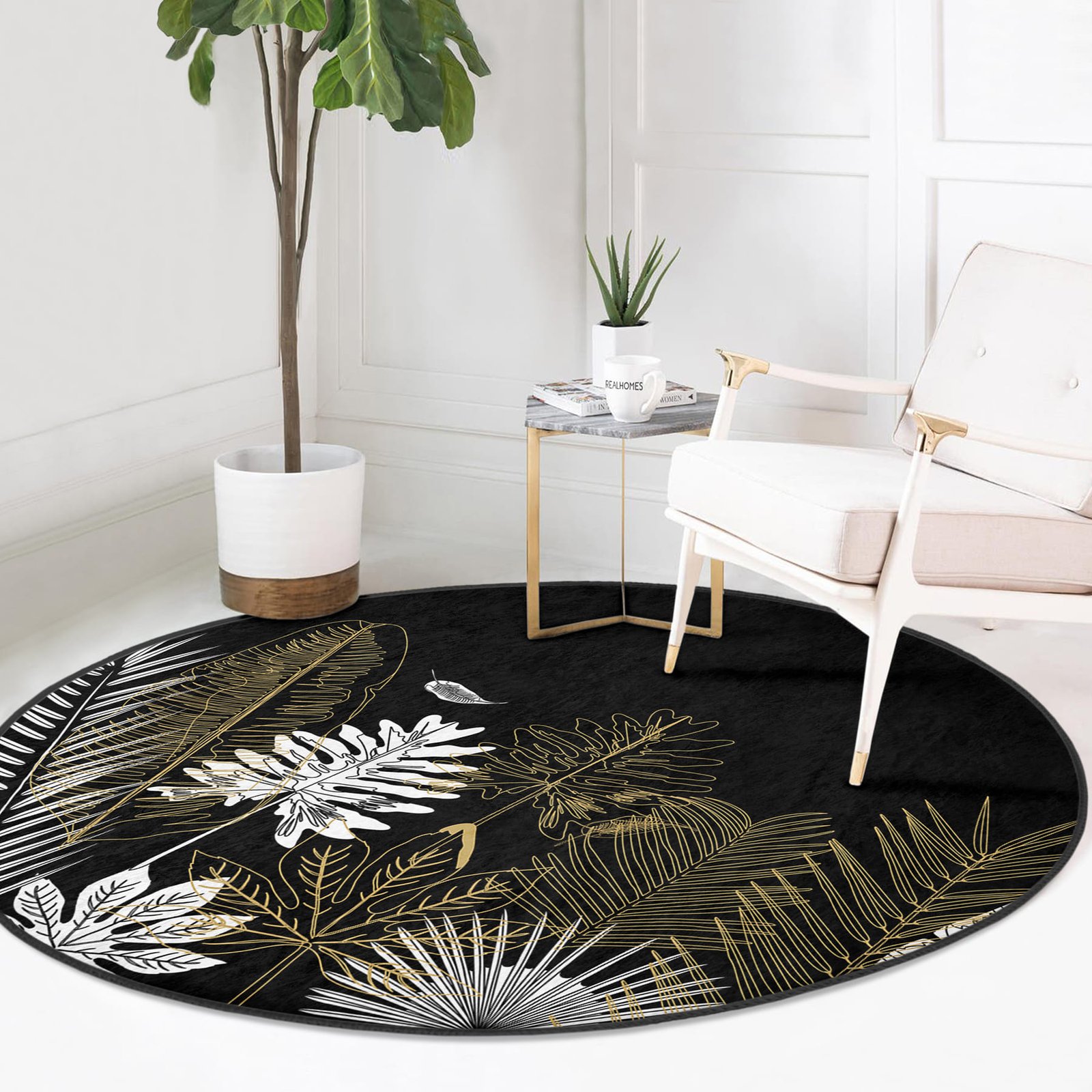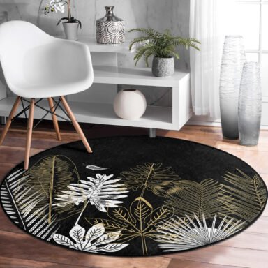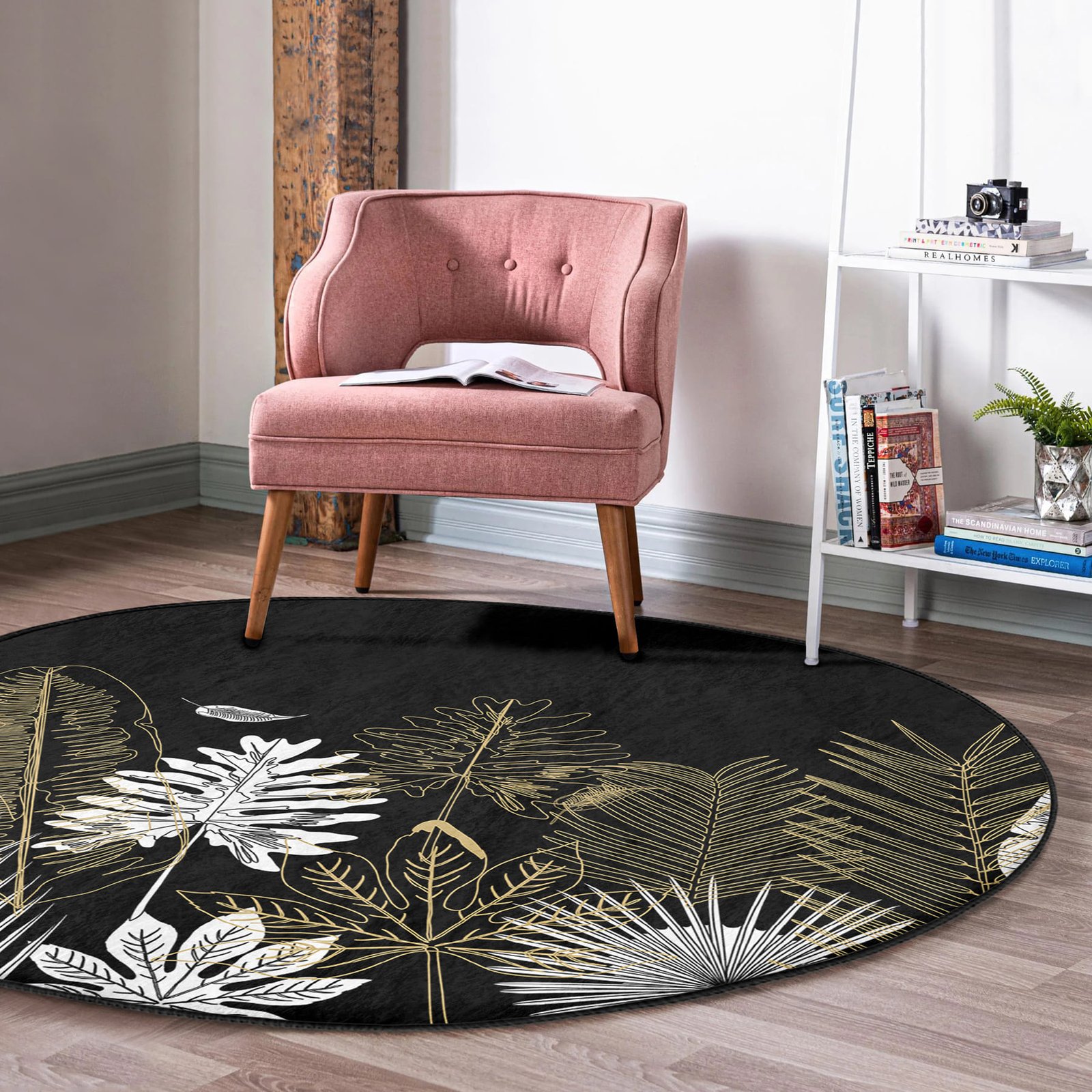 Siyah Zeminde Gold Detaylı Yaprak Desenli Modern Salon Ve Oturma Odası Kaymaz Tabanlı Yuvarlak Halı