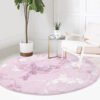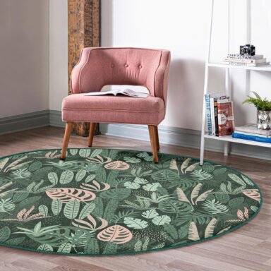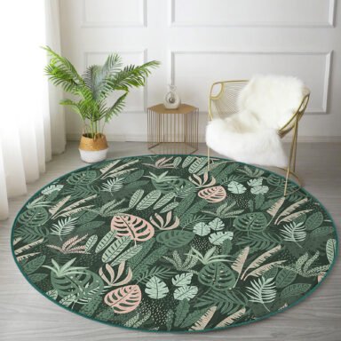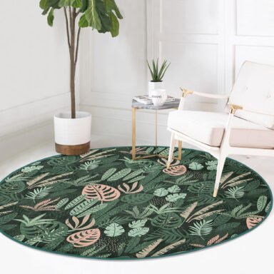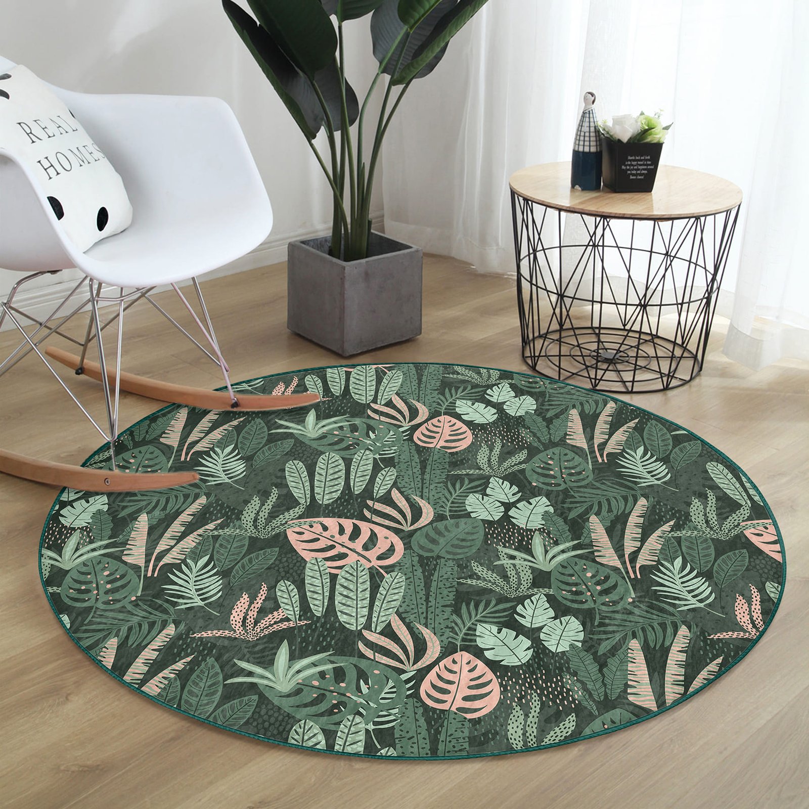Siyah Zeminde Renkli Çiçek Desenli Yeşil Salon Oturma Odası Yıkanabilir Kaymaz Tabanlı Yuvarlak Halı