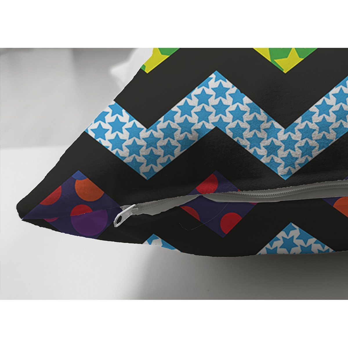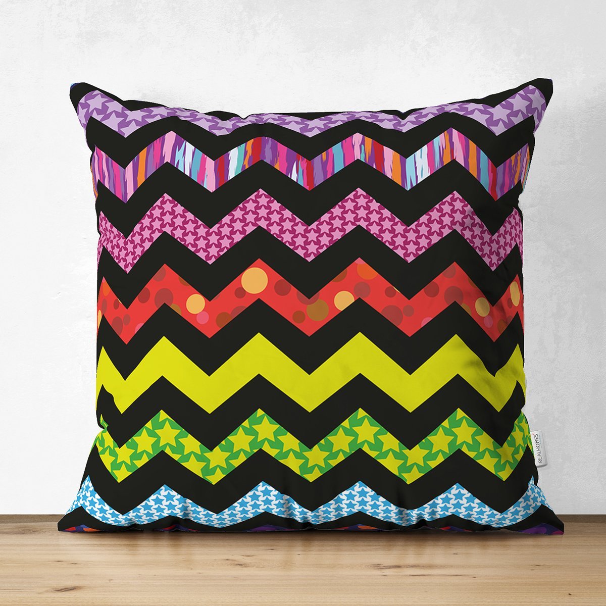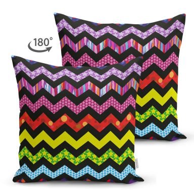 Siyah Zeminli Renkli Zikzak Motifli Dijital Baskılı Süet Yastık Kırlent Kılıfı