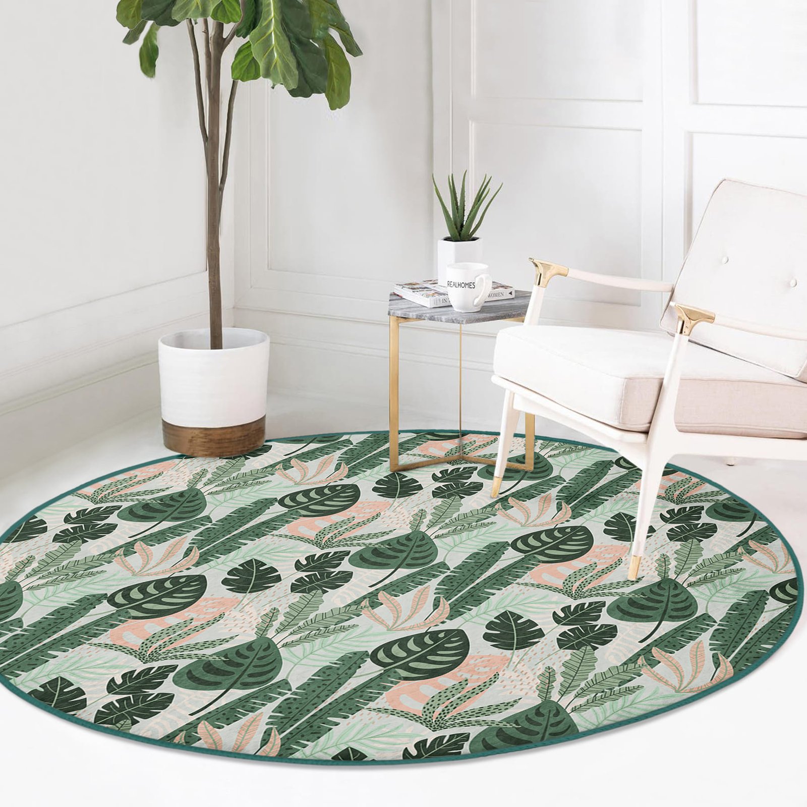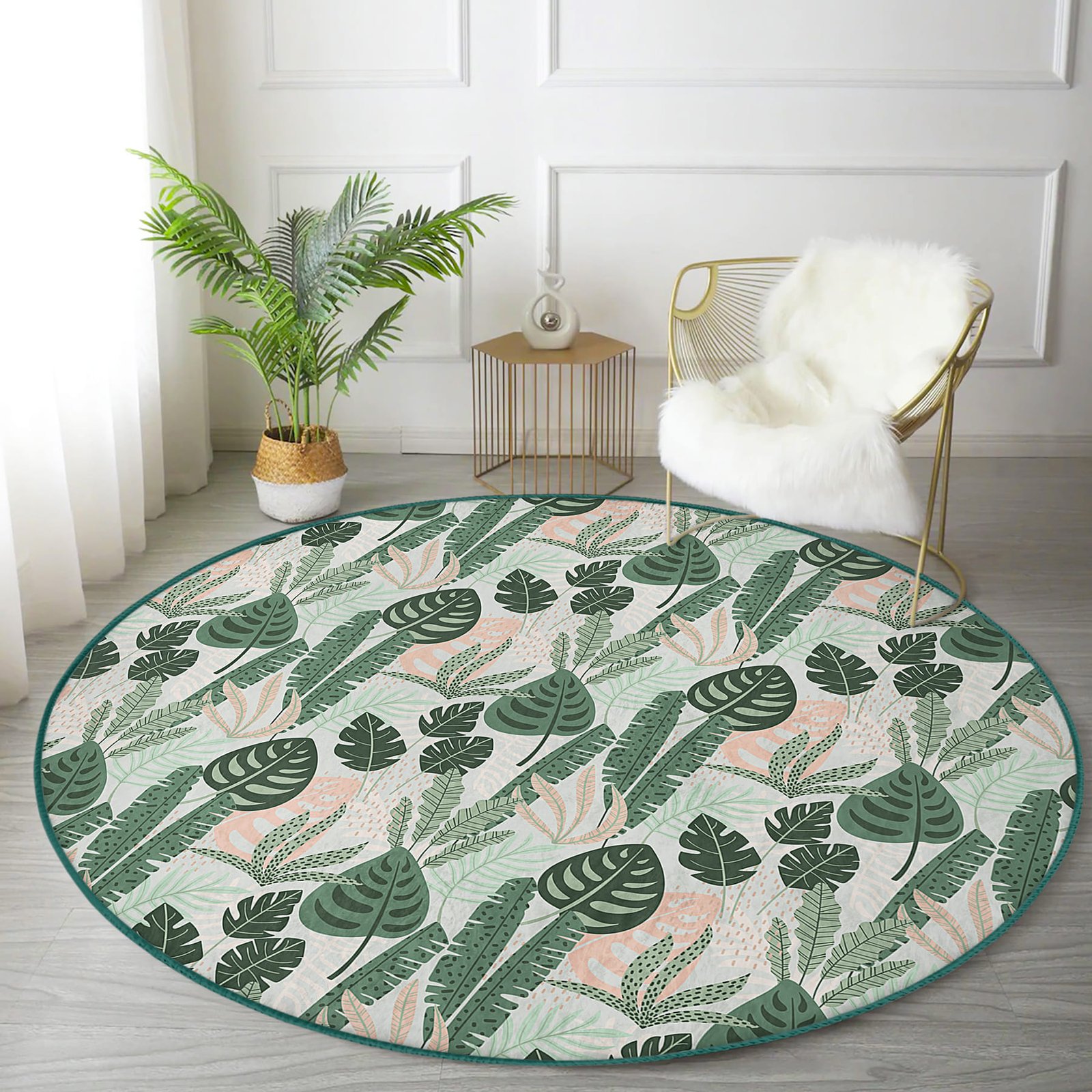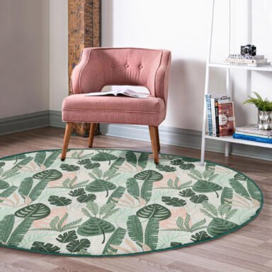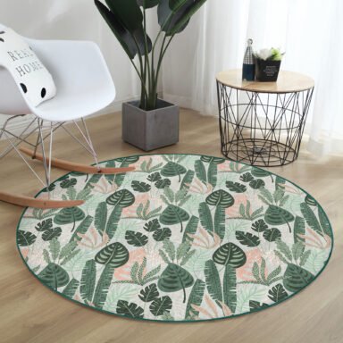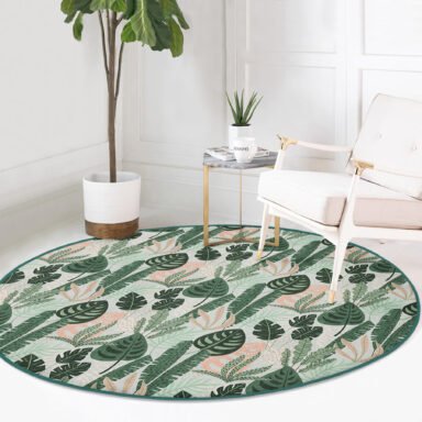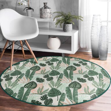 Soft Renkli Zeminde Koyu Yaprak Desenli Dijital Baskılı Yeşil Salon Kaymaz Tabanlı Yuvarlak Halı