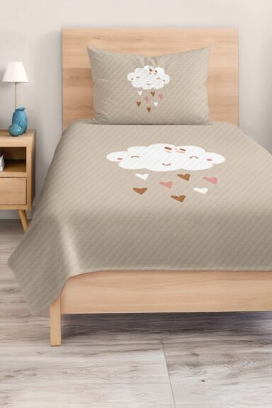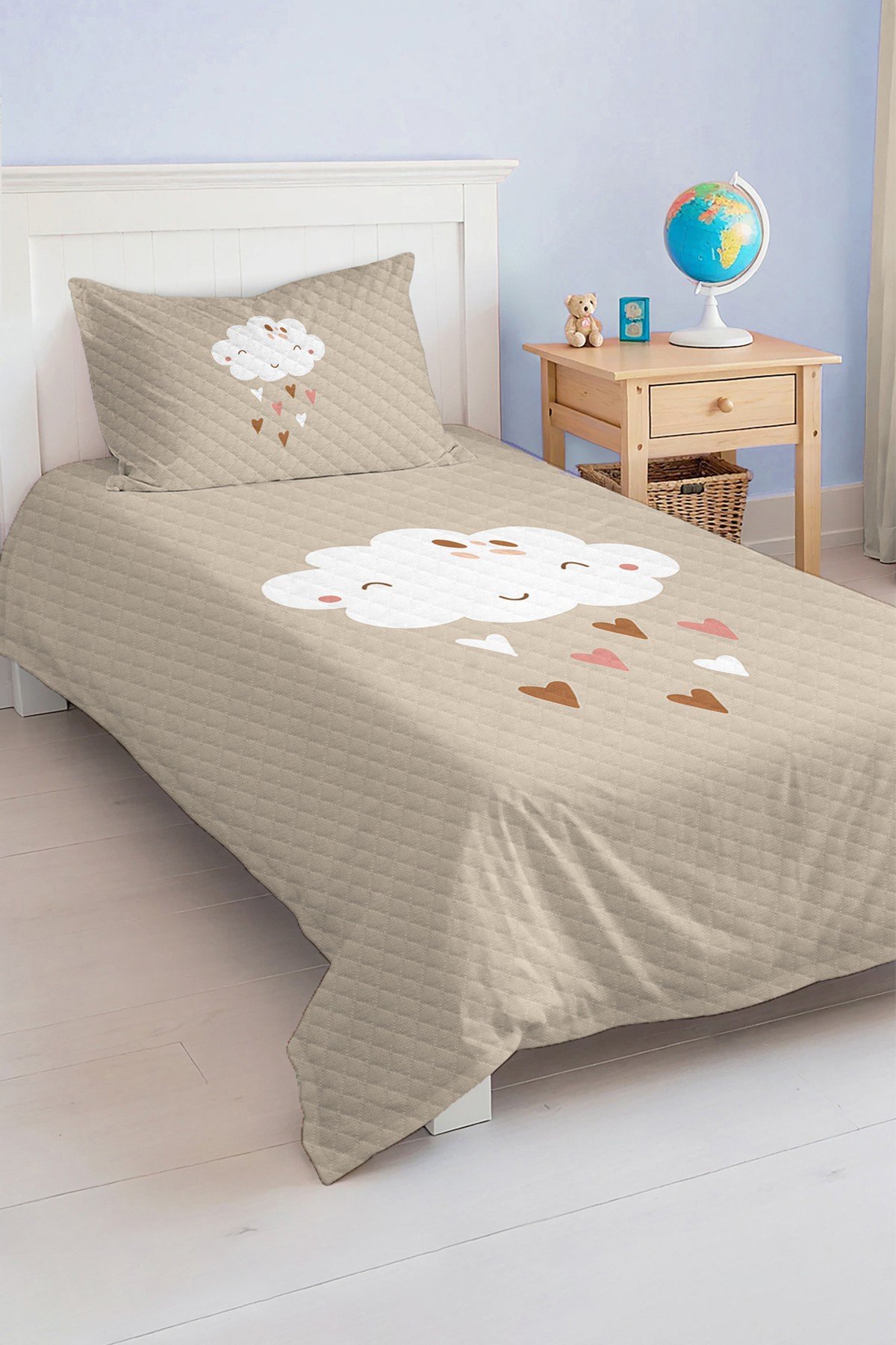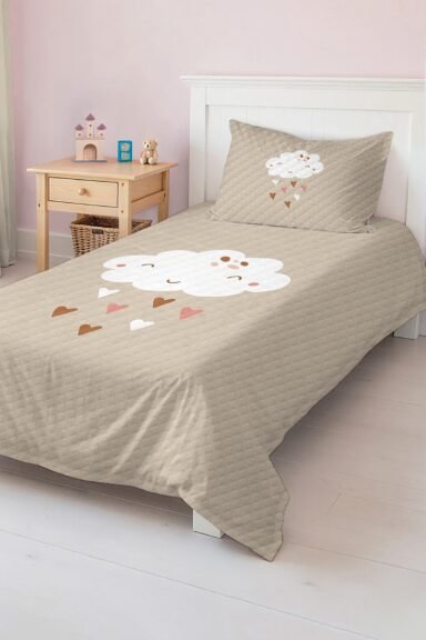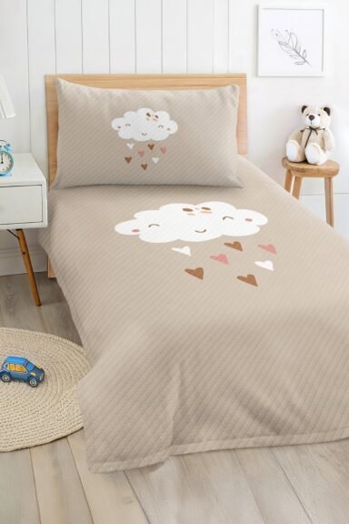 Tatlı Bulut ve Kalpli Desenli Bej Renkli Tek Kişilik Çocuk ve Genç Odası Pike Takımı
