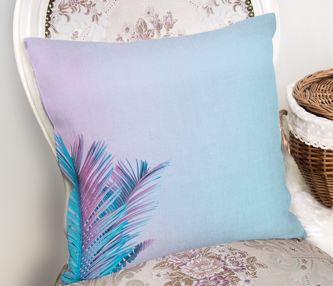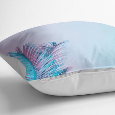 Toz Mavisi Zeminli Tropik Yapraklı Özel Tasarım Dijital Baskılı Yastık Kılıfı