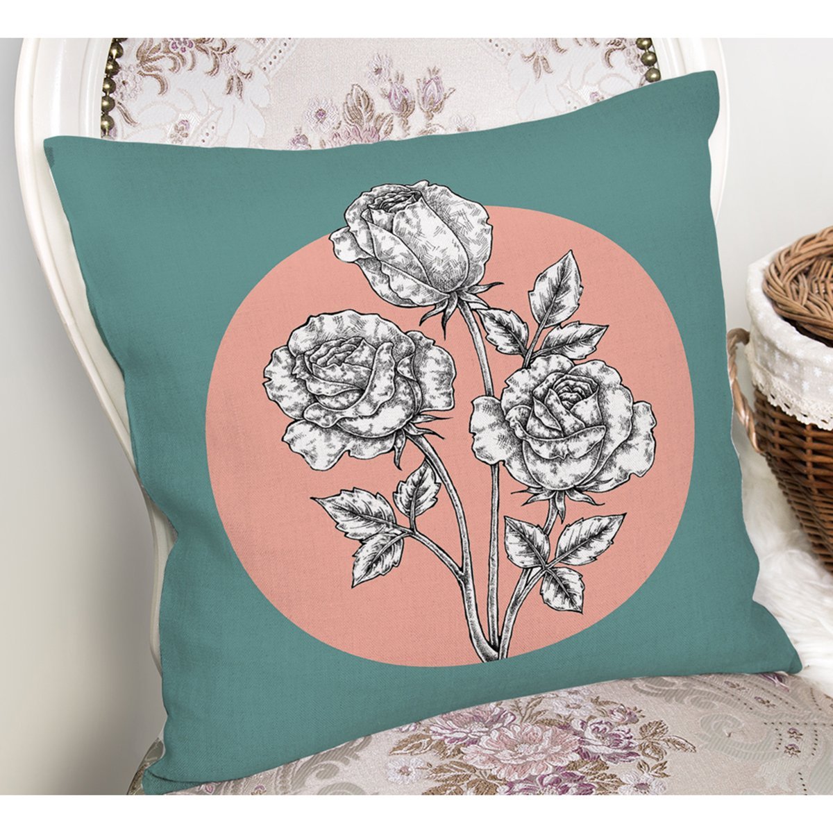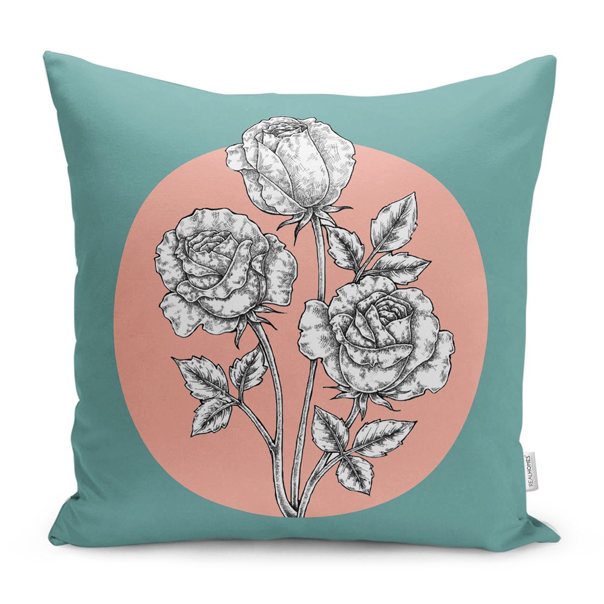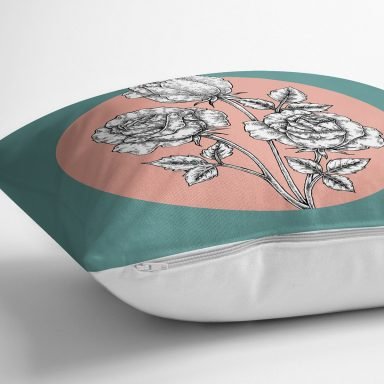 Turkuaz Pudra Zeminli Gül Motifli Yastık Kırlent Kılıfı