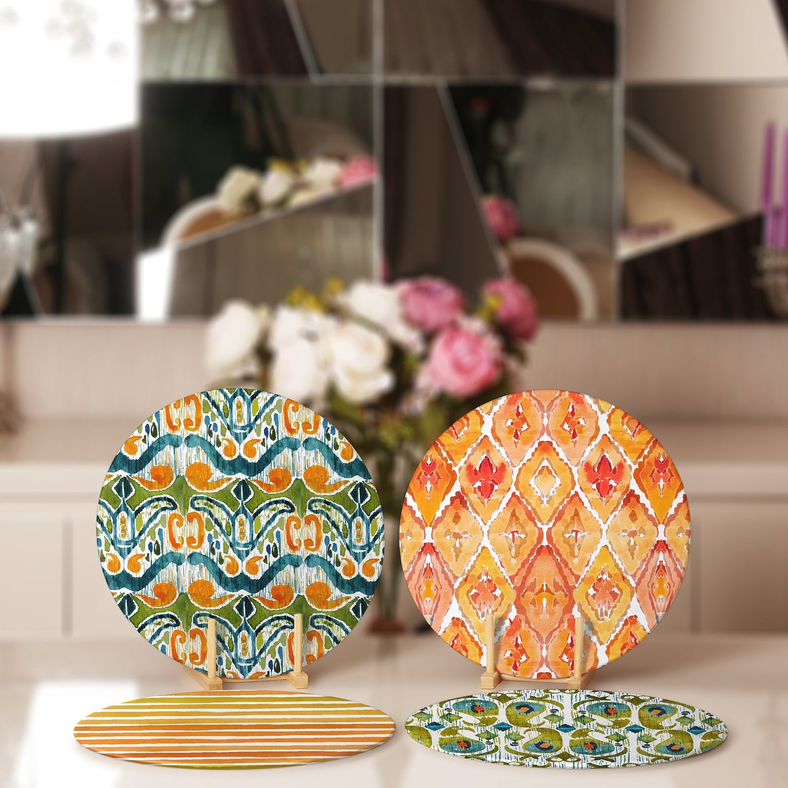 Turuncu Yeşil Renkli Suluboya Tasarımlı Dekoratif Yuvarlak Servis Altlığı & Supla