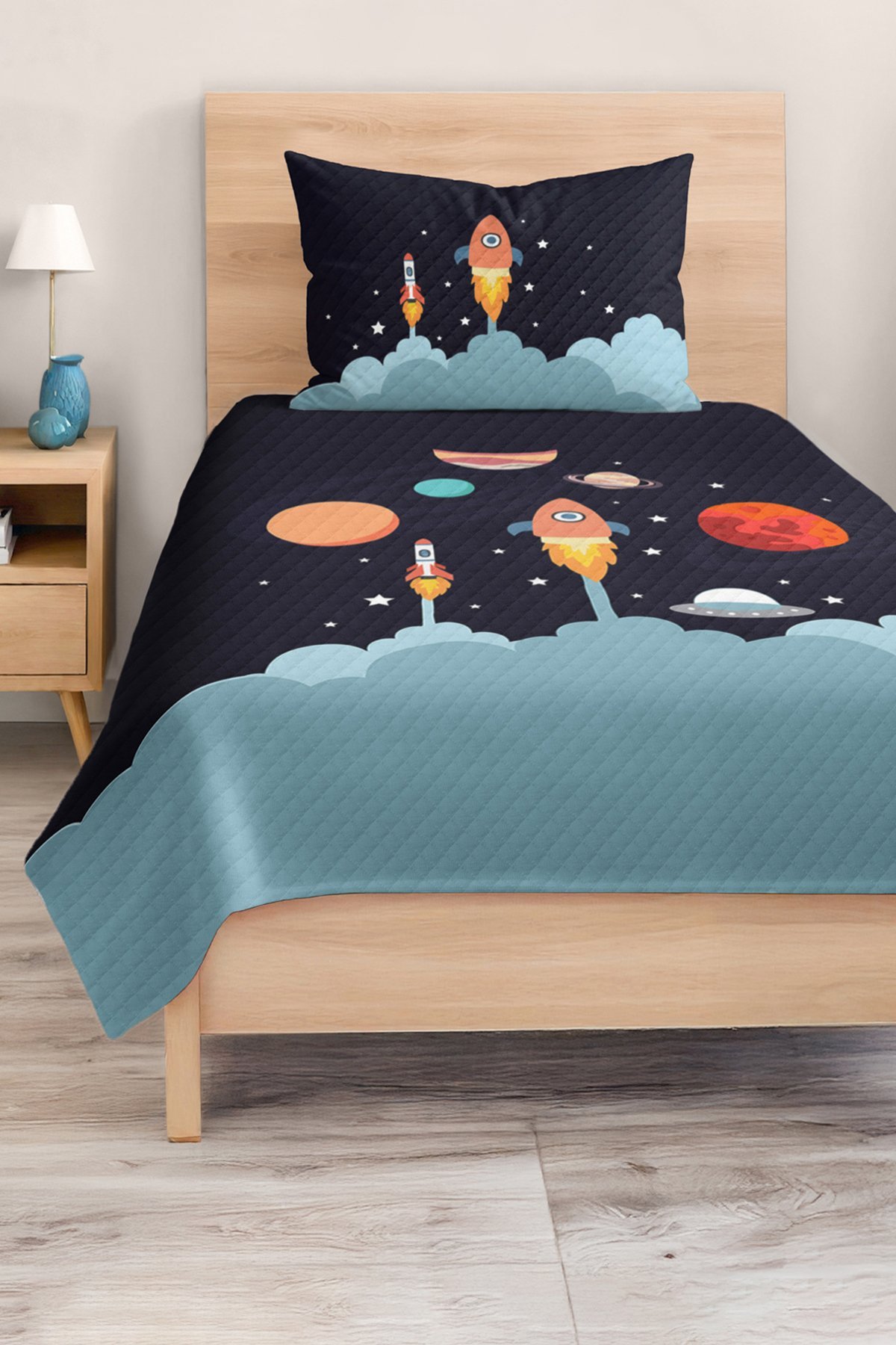Uzay Roket ve Gezegen Desenli Lacivert Çocuk ve Genç Odası Tek Kişilik Pike Takımı